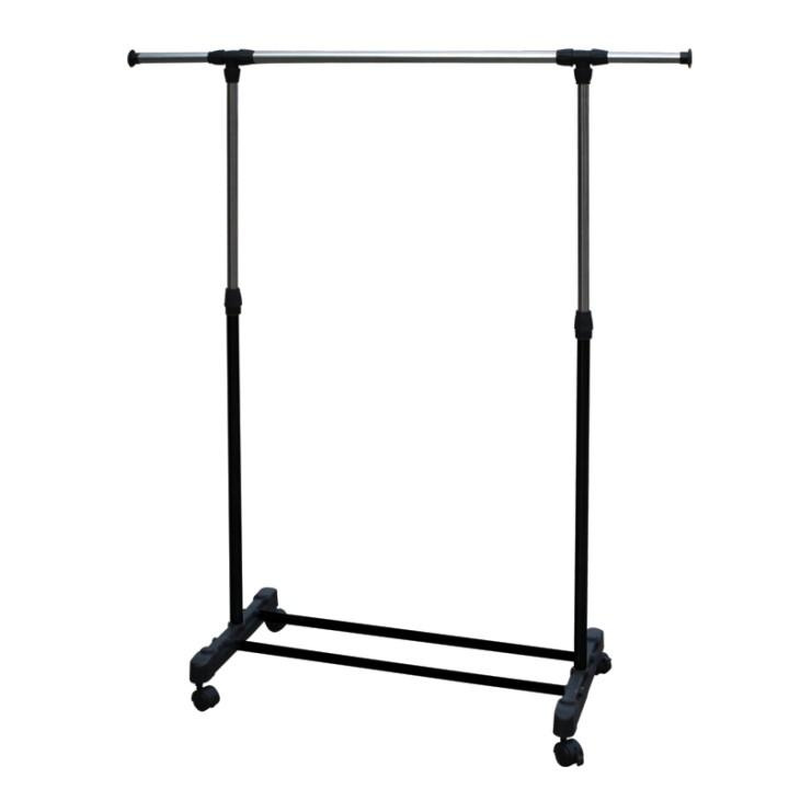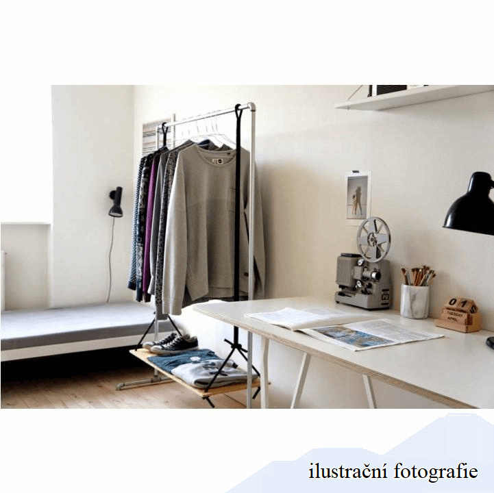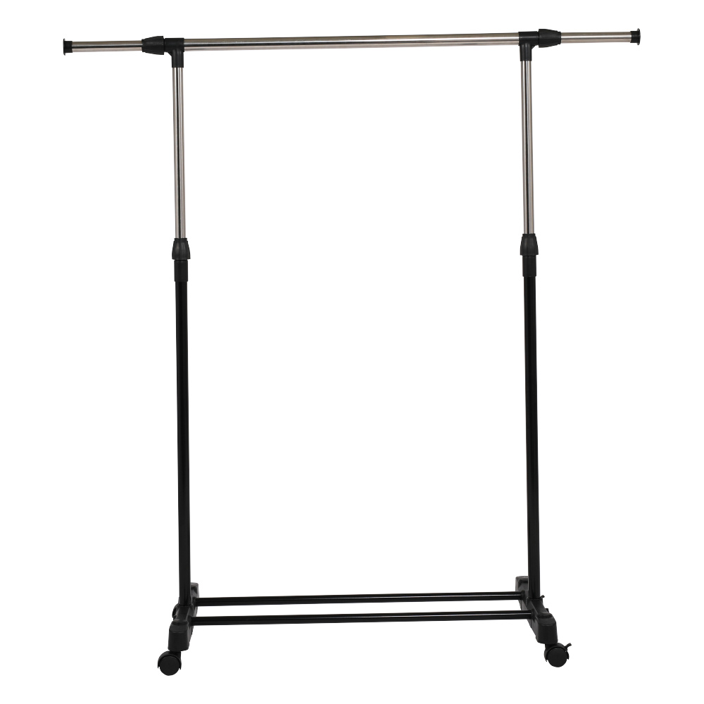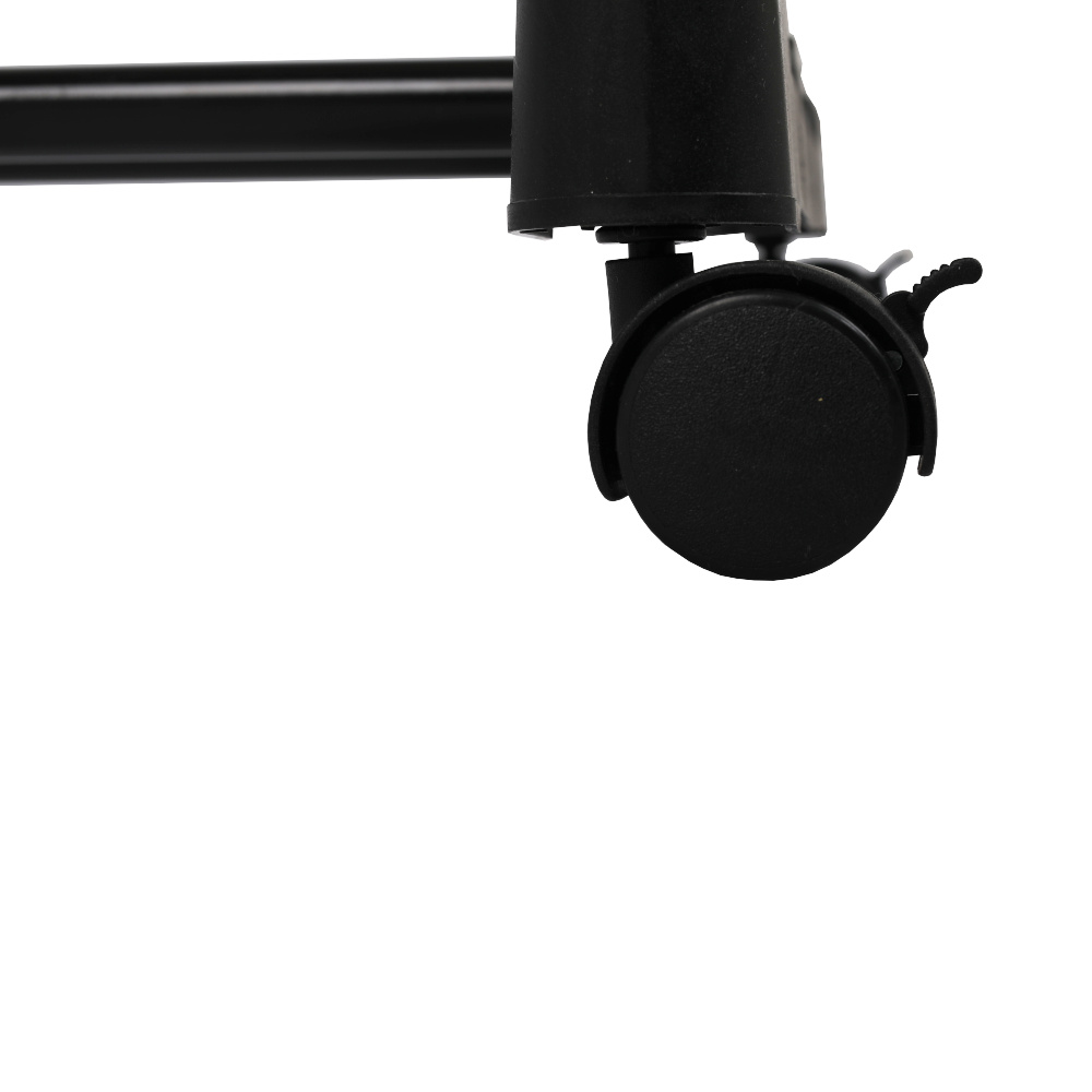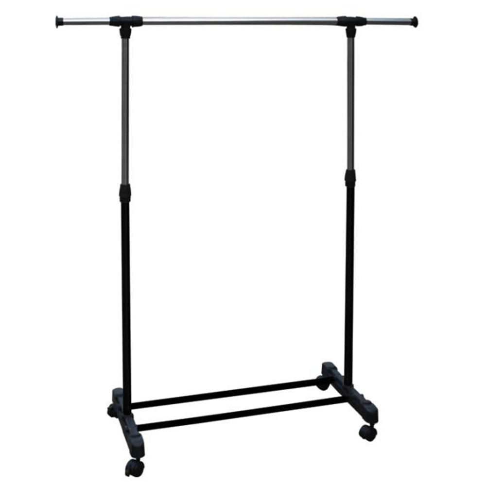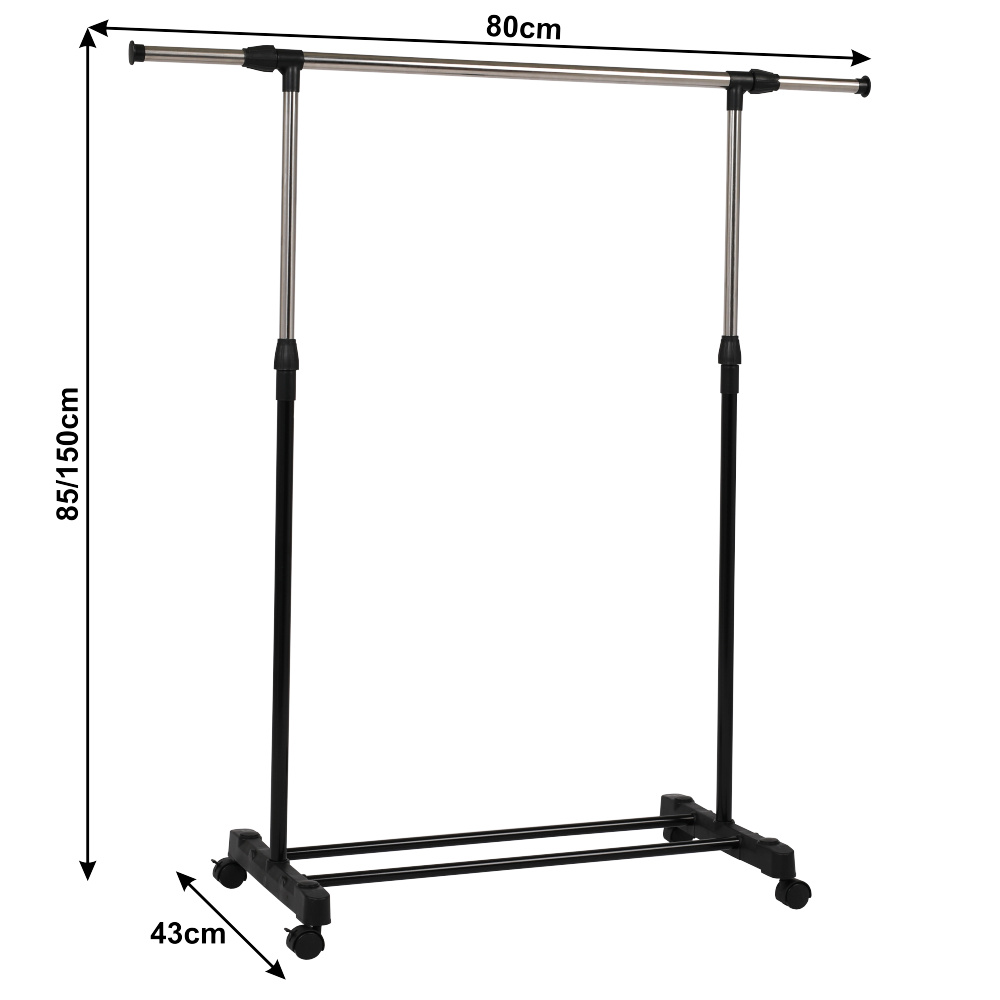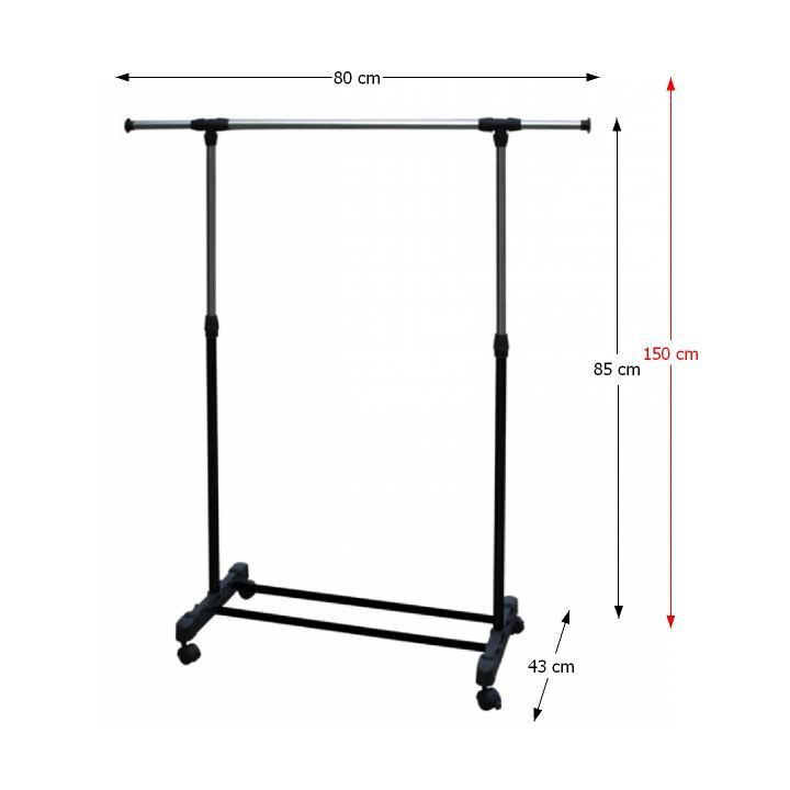 Pojízdný věšák s kolečky a jednou závěsnou výškově nastavitelnou tyčí Materiál: kov / plast Barva: černá Rozměry (ŠxHxV): 80x43x85-150 cm Hmotnost: 1,6 kg Dodávané v demontu.