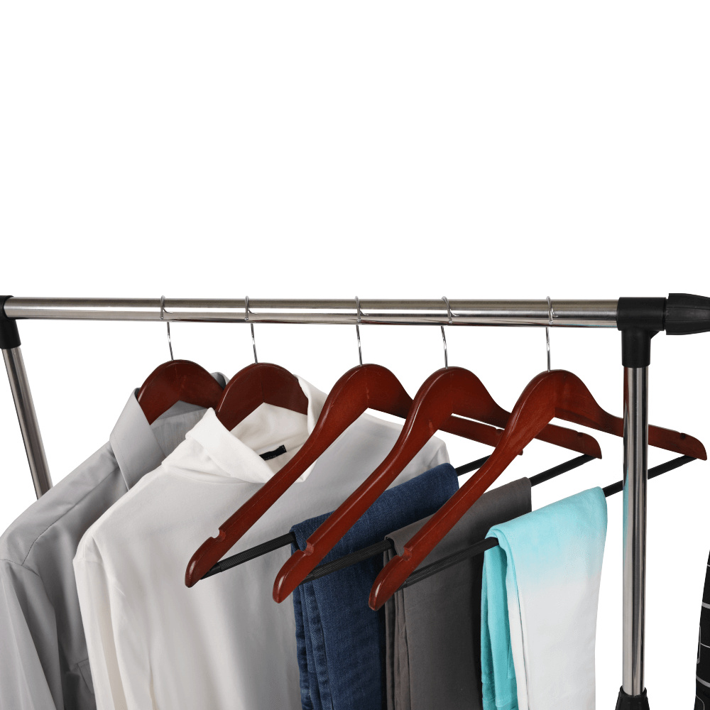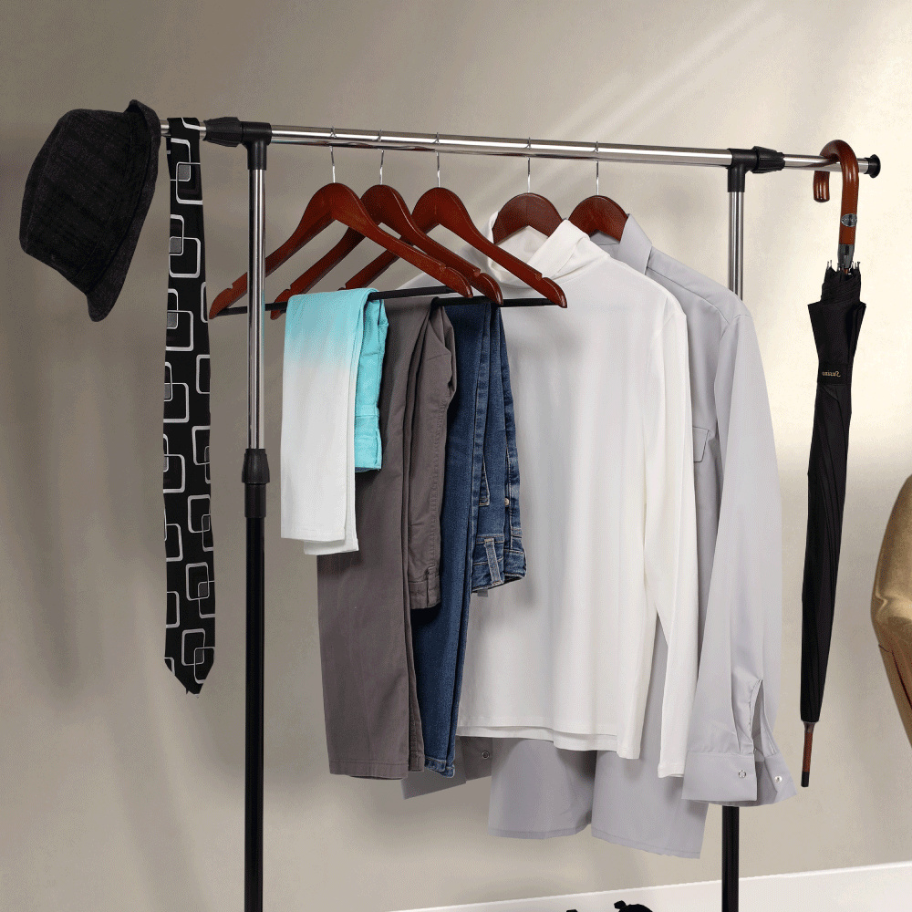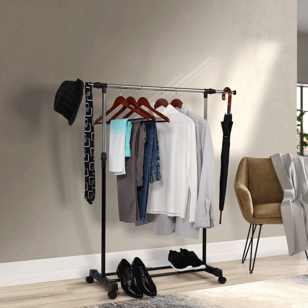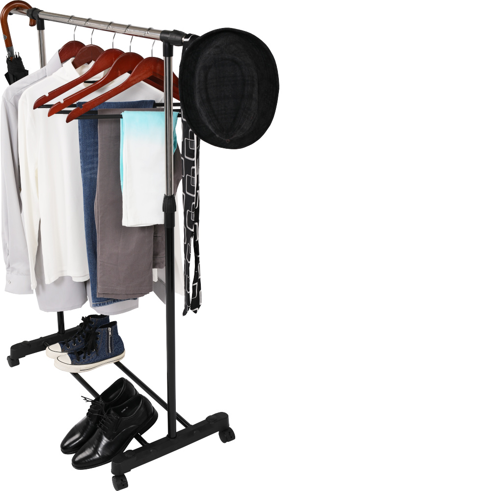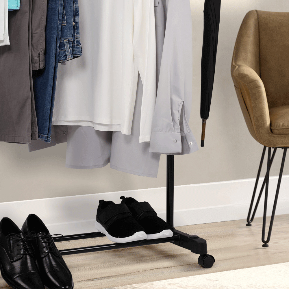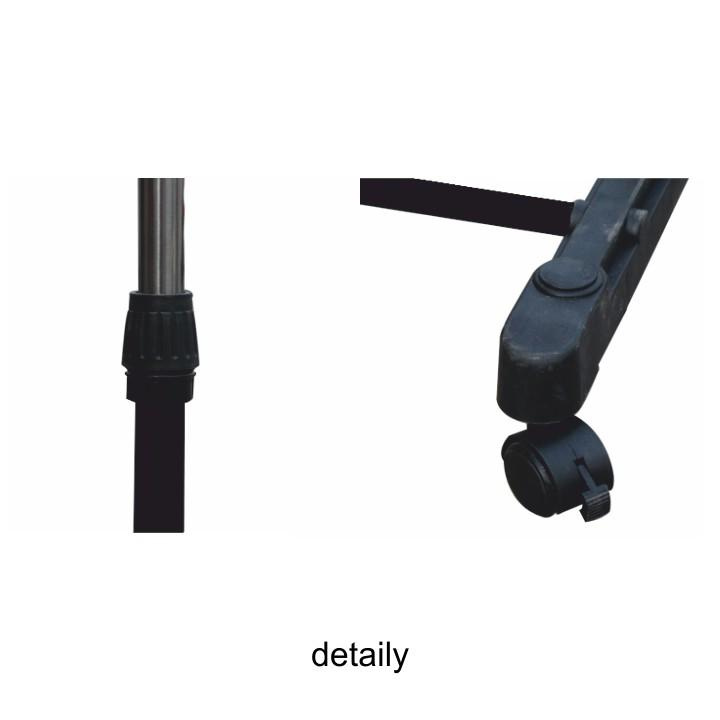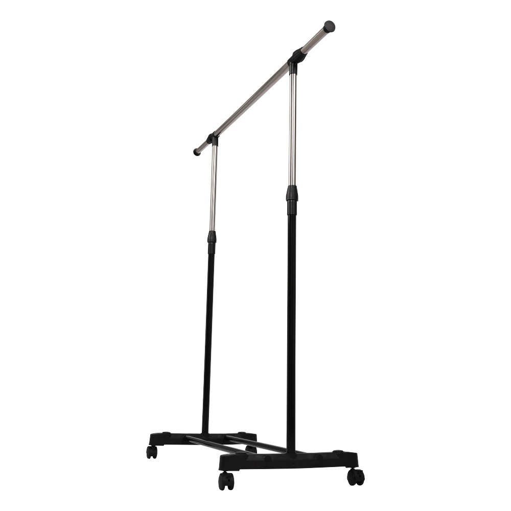 Pojízdný věšák s kolečky a jednou závěsnou výškově nastavitelnou tyčí Materiál: kov / plast Barva: černá Rozměry (ŠxHxV): 80x43x85-150 cm Hmotnost: 1,6 kg Dodávané v demontu.