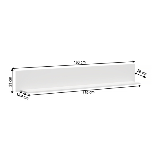 Materiál: DTD laminovaná/ABS hrany Barva: bílá Rozměry (ŠxHxV): 160x20x23 cm Tloušťka materiálu: 1,6 Nosnost: 2 kg Otevřený úložný prostor ABS hrany Dodáván v demontu