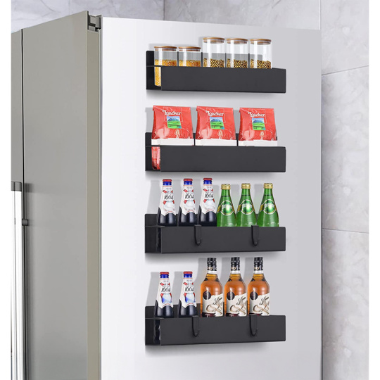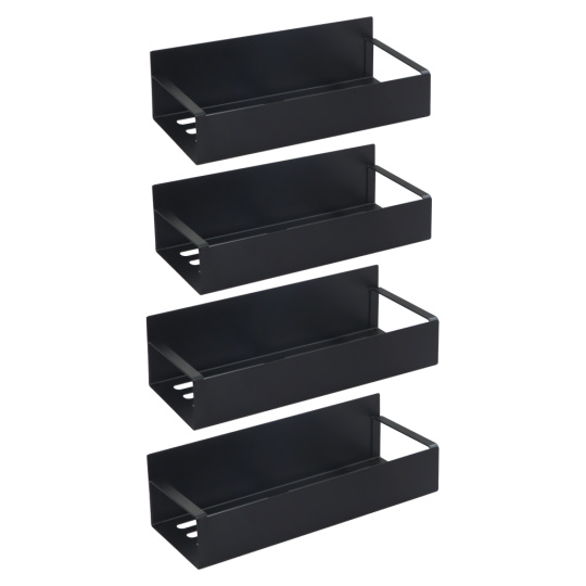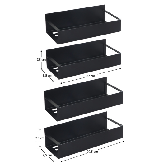 Materiál: uhlíková ocel Barva: černá Rozměry (ŠxHxV): 27x8,5x7,5 cm (2x) Rozměry (ŠxHxV): 29,5x9,5x7,5 cm (2x) Nosnost: 4 kg 4 poličky Uchycení pomocí magnetu Praktické Moderní Víceúčelové Snadná montáž Vhodné pro lednici, pračku, mikrovlnnou troubu, kovové tabule a jiné kovové povrchy Dodáváno v monte