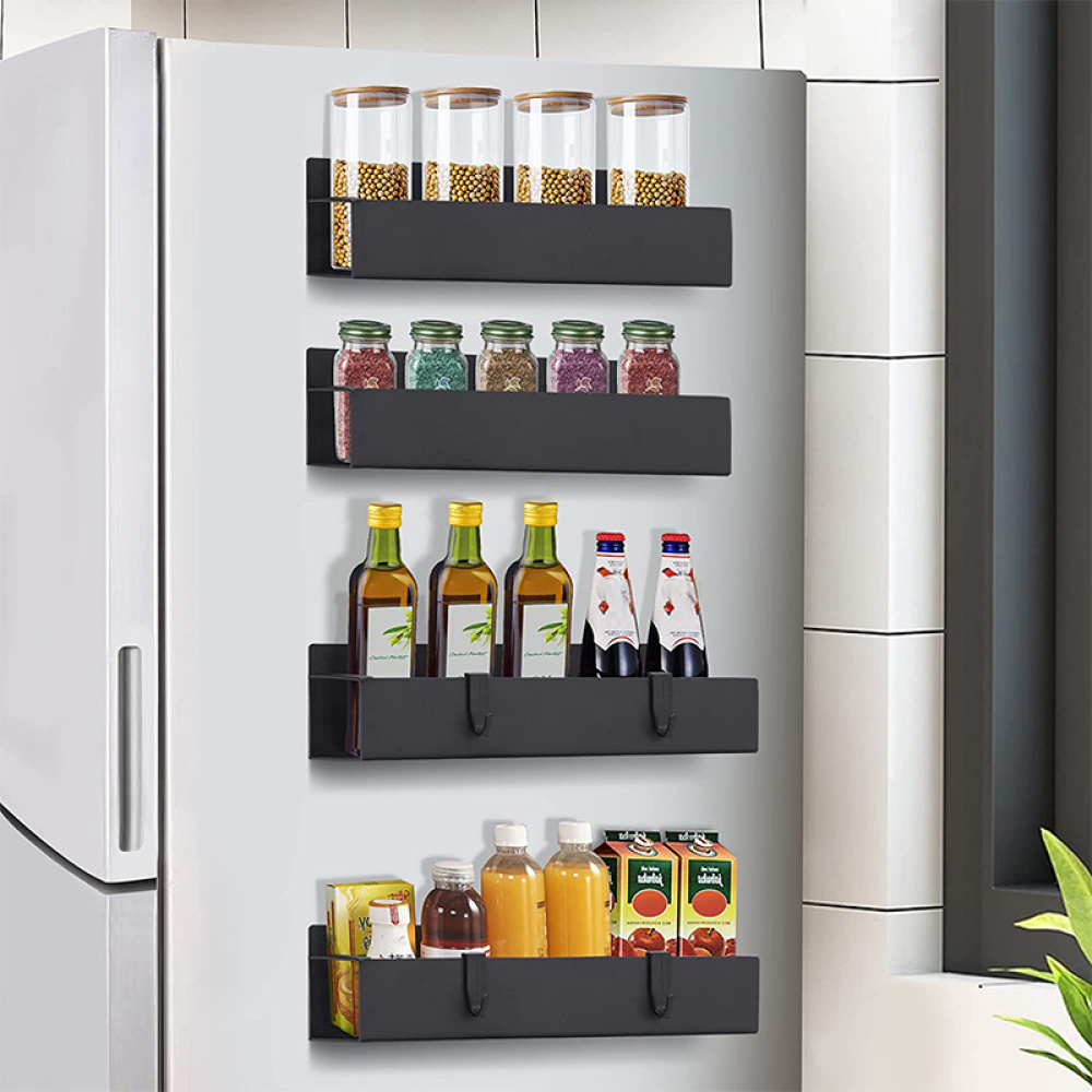 Materiál: uhlíková ocel Barva: černá Rozměry (ŠxHxV): 27x8,5x7,5 cm (2x) Rozměry (ŠxHxV): 29,5x9,5x7,5 cm (2x) Nosnost: 4 kg 4 poličky Uchycení pomocí magnetu Praktické Moderní Víceúčelové Snadná montáž Vhodné pro lednici, pračku, mikrovlnnou troubu, kovové tabule a jiné kovové povrchy Dodáváno v monte