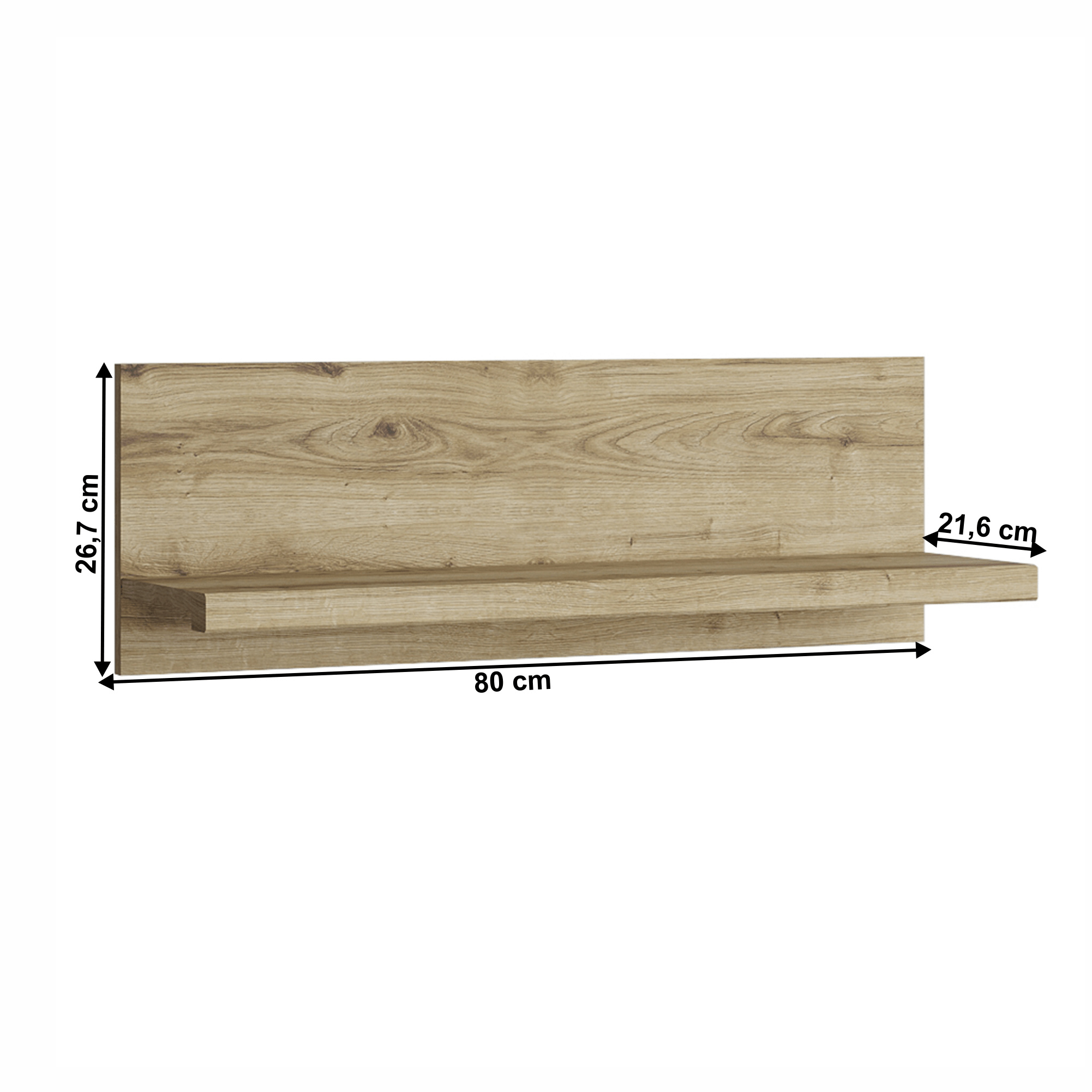 Police Dorsi 80 Materiál: DTD laminovaná Barva: dub navarra Rozměry (ŠxHxV): 80x21,6x26,7 cm Tloušťka materiálu: 1,6 cm Nosnost: 3 kg Otevřený úložný prostor Moderní design Dodáváno v demontu