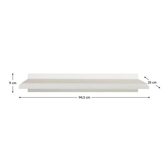 Materiál: DTD laminovaná Barva: alpská bílá Rozměry (ŠxHxV): 94,5x25x9 cm Tloušťka materiálu: 1,6 cm Nosnost: 4 kg Závěsná Otevřený úložný prostor Doporučujeme připevnit ke stěně Dodáváno v demontu