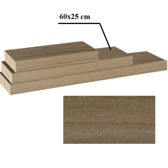 Police, která se stává součástí stěny díky skrytému nástěnnému kování GANA Materiál: MDF Provedení: dub troufnete Rozměry (ŠxHxV): 60x25x5 cm. Nosnost police je 5-8 kg