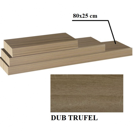 Police, která se stává součástí stěny díky skrytému nástěnnému kování. Materiál: MDF Provedení:  dub trufel Rozměry ŠxHxV: 80x25x5 cm. Nosnost police je 5-8 kg
