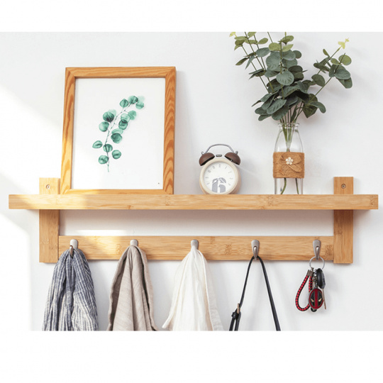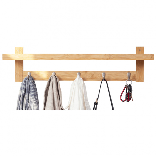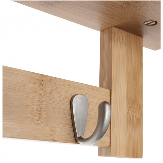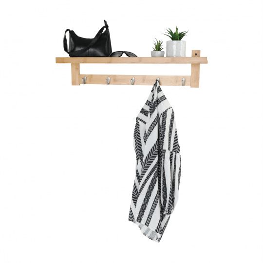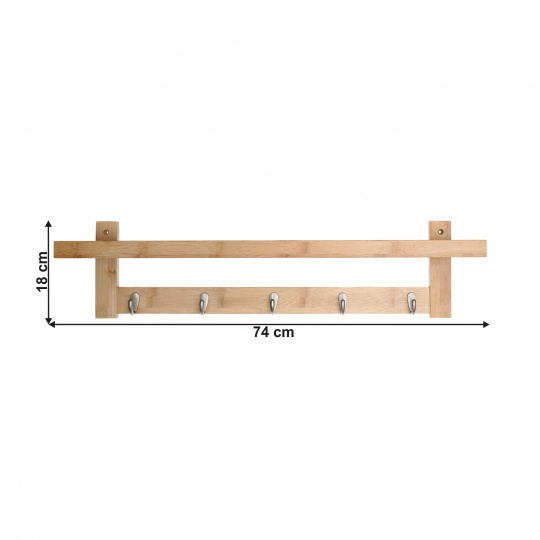 Materiál: bambus lakovaný / ocel Barva: přírodní Rozměry (ŠxHxV): 74x12x18 cm pět háčků police Nosnost: 10 kg Vhodná do koupelny a předsíně