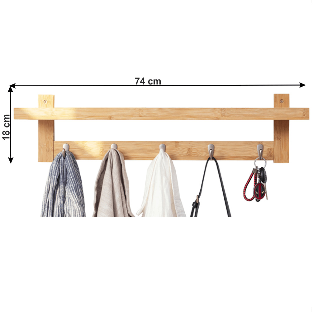 Materiál: bambus lakovaný / ocel Barva: přírodní Rozměry (ŠxHxV): 74x12x18 cm pět háčků police Nosnost: 10 kg Vhodná do koupelny a předsíně