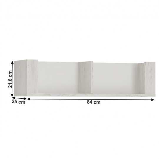 Police typ 62 ze sektorové sestavy ANGEL vhodná na zařízení dětských a studentských pokojů, materiál: DTD lamonovaná, barevné provedení: bílá craft. rozměry (ŠxVxH): 84x21,6x25 cm, Tloušťka materiálu: 16 mm, dodávané v demontu