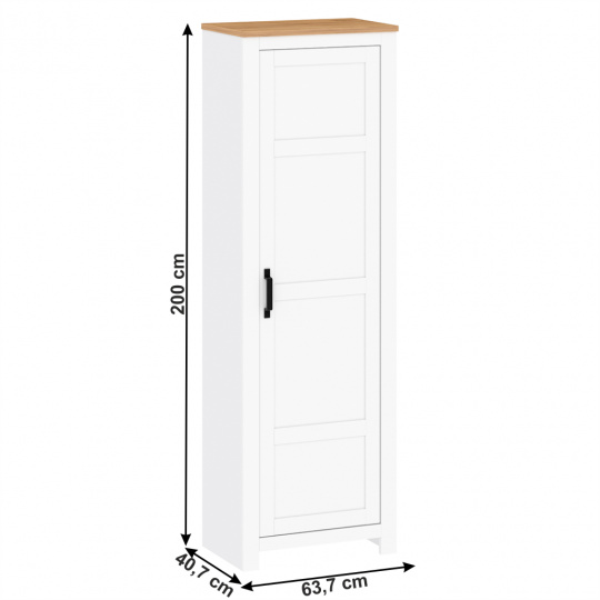 Materiál: DTD laminovaná / ABS hrany/MDF laminovaná Barva: bílá alba / dub craft zlatý Rozměry (ŠxHxV): 63,7x40,7x200 cm Tloušťka materiálu korpus: 16 mm Tloušťka materiálu horní desky: 22 mm Tloušťka materiálu dvířek: 19 mm Výška spodního prostoru od podlahy: 7,2 cm Univerzální skříň Ozdobná úchytka jednodveřová Dodávané v demontu
