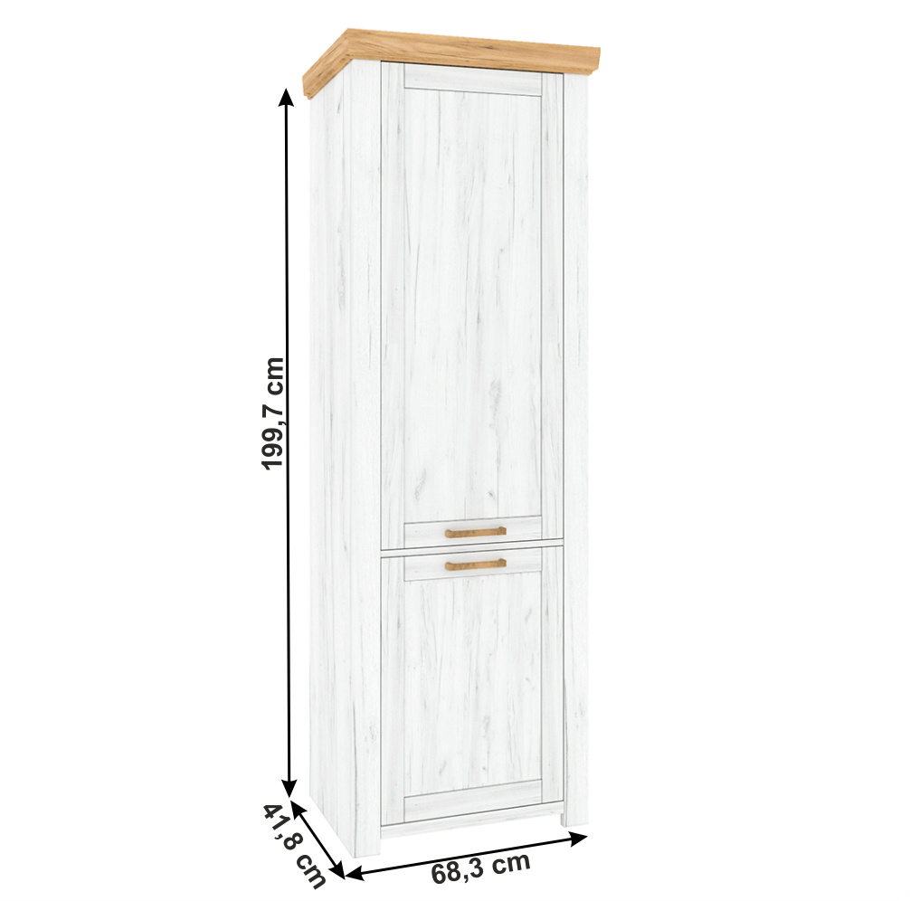 Materiál: DTD laminovaná / MDF laminovaná Barva: dub craft zlatý / dub craft bílý Rozměry (ŠxHxV): 68,3x41,8x199,7 cm Tloušťka materiálu korpus: 16 mm Tloušťka materiálu vrchní deska: 22 mm Tloušťka materiálu dvířka: 19 mm Výška spodního prostoru od podlahy je 4,2 cm Dodávané v demontu