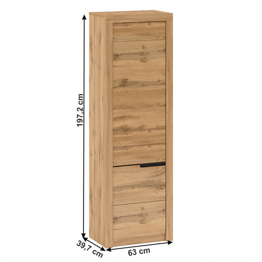 Materiál: DTD laminovaná / MDF fóliovaná Barva: dub Wotan Rozměry (ŠxHxV): 63x39,7x197,2 cm Tloušťka materiálu korpus: 16 mm Tloušťka materiálu dvířka: 19 mm dvě skříňky S policemi levá Dodávané v demontu