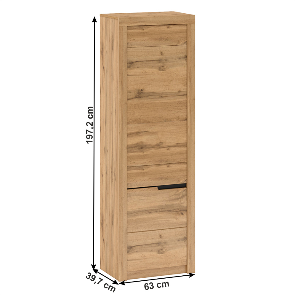 Materiál: DTD laminovaná / MDF fóliovaná Barva: dub Wotan Rozměry (ŠxHxV): 63x39,7x197,2 cm Tloušťka materiálu korpus: 16 mm Tloušťka materiálu dvířka: 19 mm dvě skříňky S policemi levá Dodávané v demontu