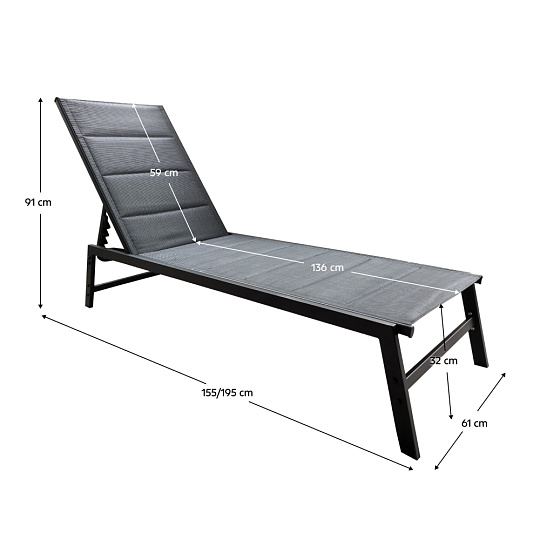 Materiál: kov/látka Barva: černá Rozměry (ŠxHxV): 61x155x91 cm Výška sedu: 32 cm Hloubka sedu: 136 cm Výška zádové opěrky: 59 cm Celková hloubka po sklopení: 195 cm Nosnost: 110 kg Zahradní Polohovací 4 pozice sklápění opěradla Dodáváno v demontu