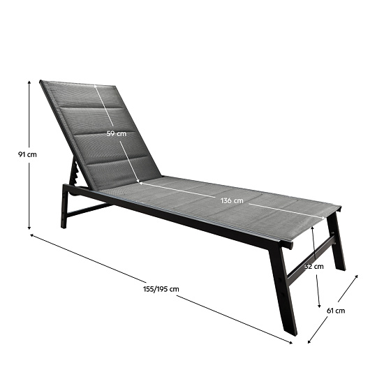 Materiál: kov/látka Barva: černá/šedá Rozměry (ŠxHxV): 61x155x91 cm Výška sedu: 32 cm Hloubka sedu: 136 cm Výška zádové opěrky: 59 cm Celková hloubka po sklopení: 195 cm Nosnost: 110 kg Zahradní Polohovací 4 pozice sklápění opěradla Dodáváno v demontu