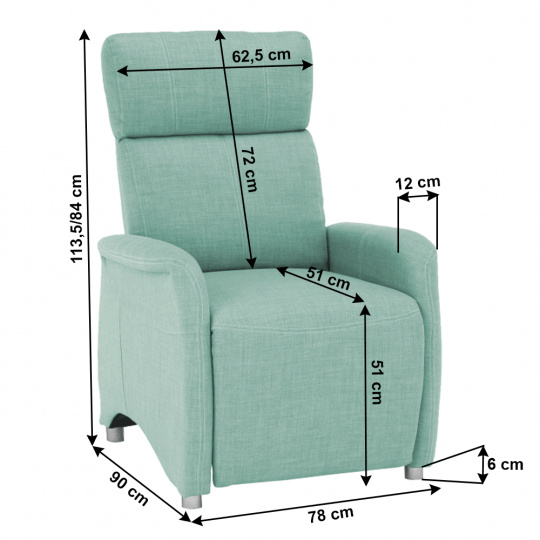 Polohovací TV křeslo s podnoží FOREST materiál: látka Oděruodolnost textilie podle testu Martindale: 90 000 oděrek barva: mentolová Rozměry (ŠxHxV): 78x90x113,5 / 84 cm, Výška sezení: 51 cm Hloubka sezení: 51 cm Nosnost 150 kg Výška zádové opěrky: 72 cm Šířka zádové opěrky: 62,5 cm Výška nožiček: 6 cm Šířka područky: 12 cm Celková délka po rozložení: 164 cm relaxační polohovací Polohovací opěradlo zad a podnož Dodávané v demontu