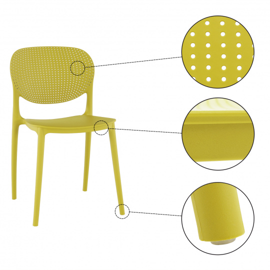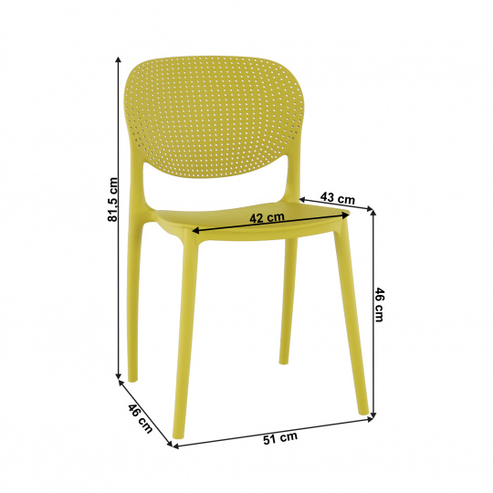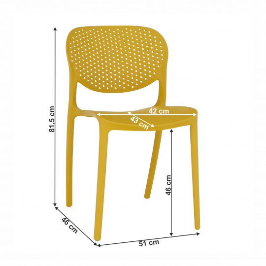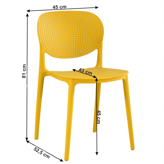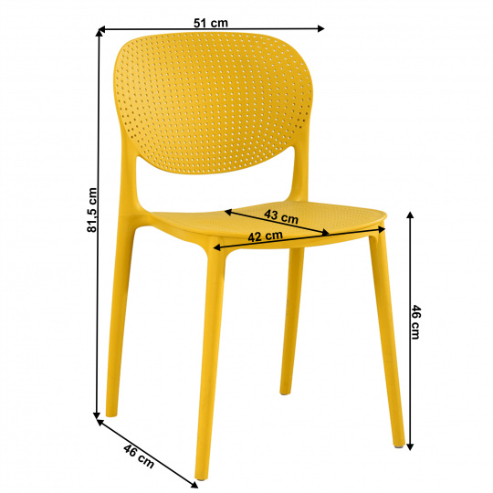 Materiál: plast Barva: žlutá Rozmery (ŠxHxV): 46x53x81,5 cm Výška sedu: 46 cm Hloubka sedu: 43 cm Šířka sezení: 42 cm Nosnosť: 90 kg Stohovateľná Vhodná do interiéru aj exteriéru Dodávané v monte