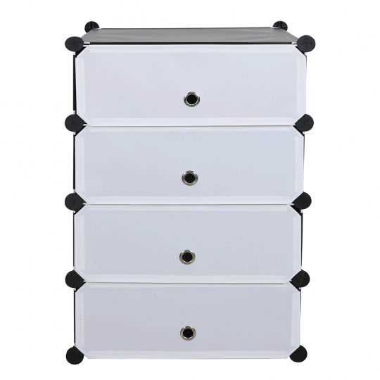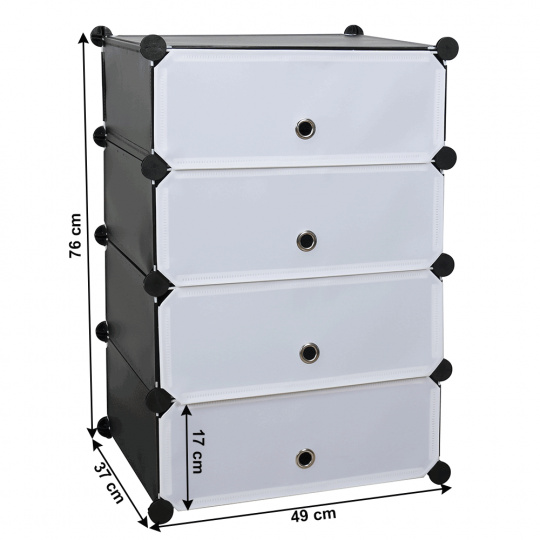 Materiál konstrukce: kov Materiál box: plast Barva: černá / bílá Rozměry (ŠxHxV): 49x37x76 cm Spojovací prvky vyrobené z pevného ABS plastu Variabilní rozmístění boxů Nosnost boxu: 3 kg 4 úložné boxy Boxy je třeba rovnoměrně zatěžovat Organizér / botník na boty kovová konstrukce Vhodný do předsíní a hal Všestranné využití nejen jako botník Dodávané v demontu