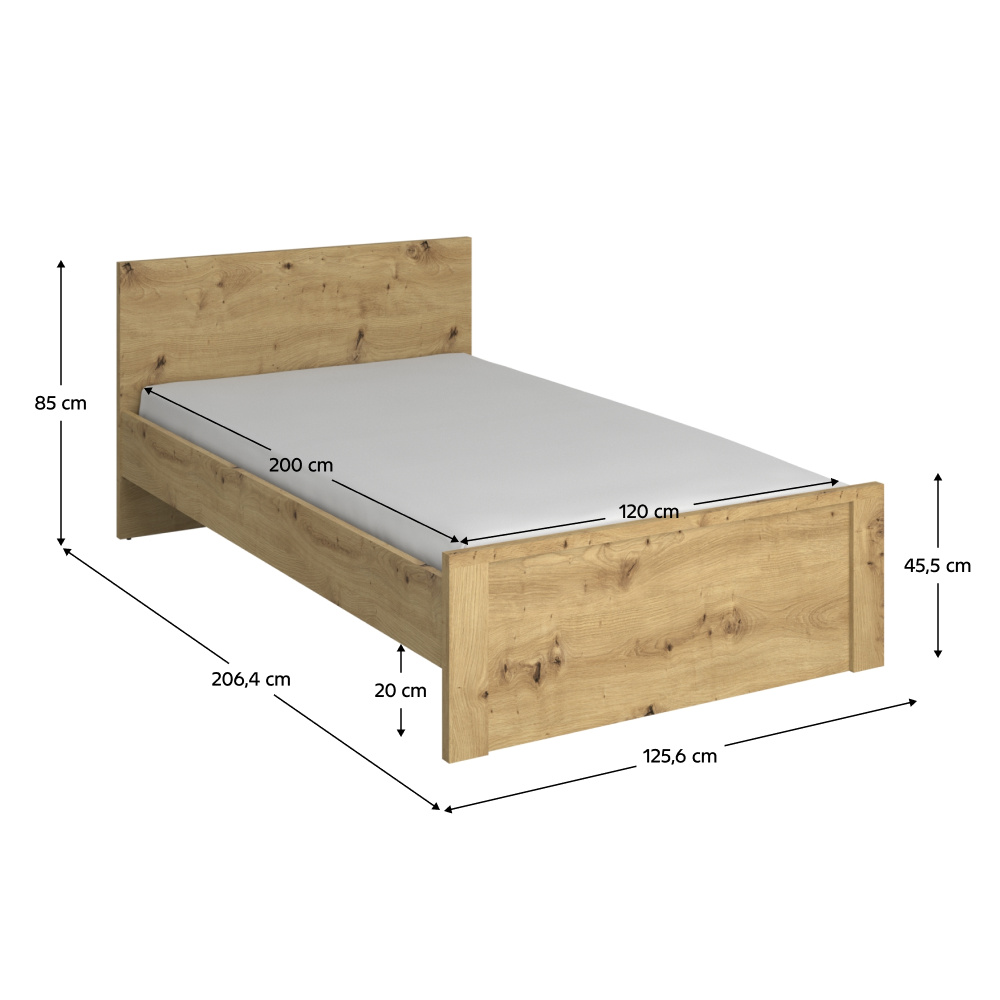 Materiál: DTD laminovaná/ABS hrany Barva: dub artisan Rozměry (ŠxHxV): 125,6x206,4x85 cm Tloušťka materiálu: 1,6-3,2 cm Rozměry plocha na spaní (ŠxD): 120x200 cm Výška spaní: 45,5 cm Doporučená výška matrace: 14,5 cm Výška spodního prostoru od podlahy: 20 cm Nosnost na osobu: 100 kg Dodáváno bez matrace a roštu Plastové nožičky Moderní design Dodáváno v demonte