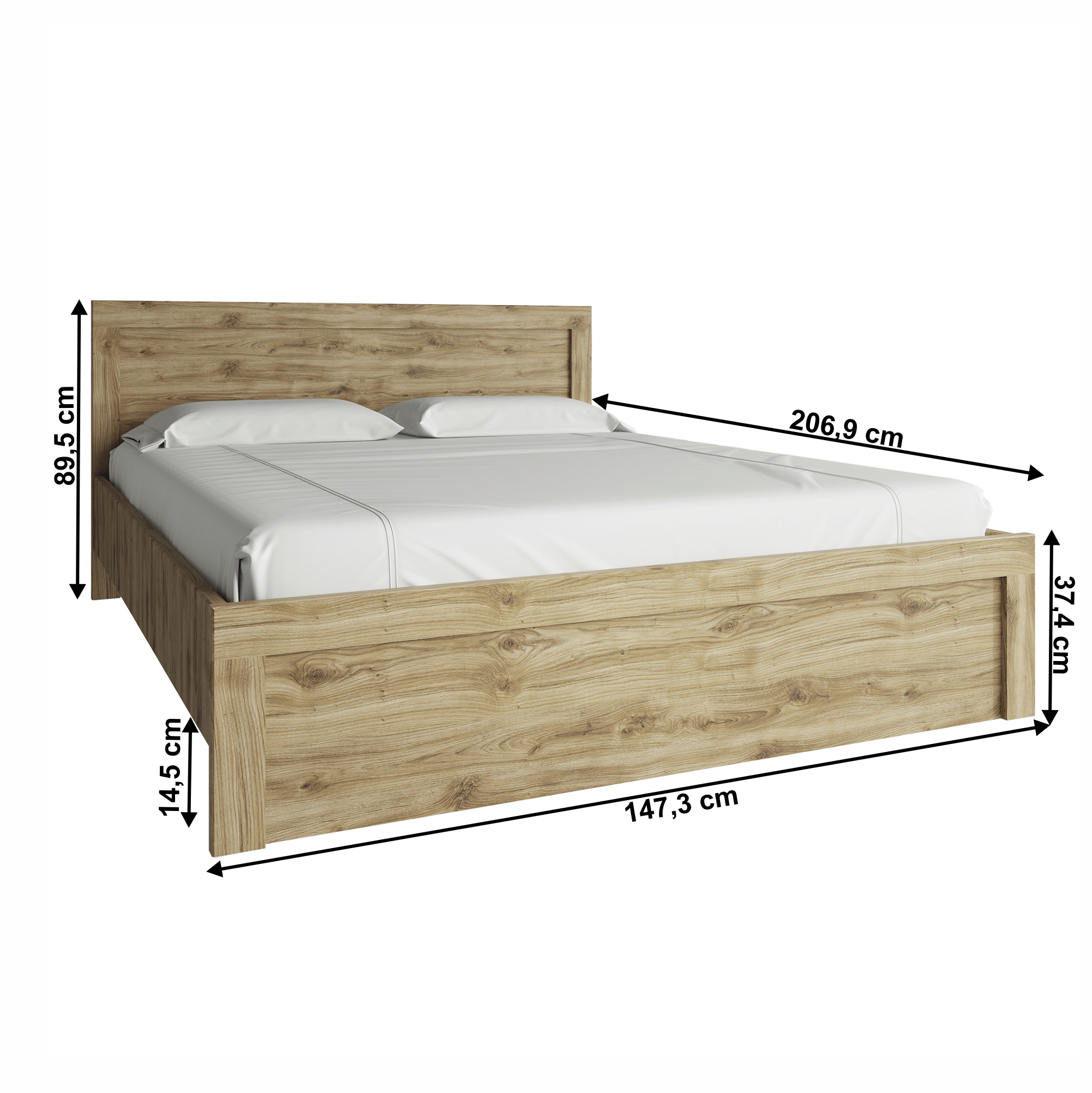 Postel DORSI 140 Materiál: DTD laminovaná/MDF Barva: dub navarra Rozměry (ŠxHxV): 147,3x206,9x89,5 cm Plocha na spaní (ŠxD): 140x200 cm Tloušťka materiálu: 1,6 cm Výška spodního prostoru od podlahy: 14,5 cm Doporučená výška matrace: min 4 cm Výška bočnice: 37,4 cm Nosnost na lůžko: 100 kg Bez úložného prostoru Dodáváno bez matrace a roštu Možnost dokoupit rošt a matraci z naší nabídky Moderní design Dodáváno v demontu