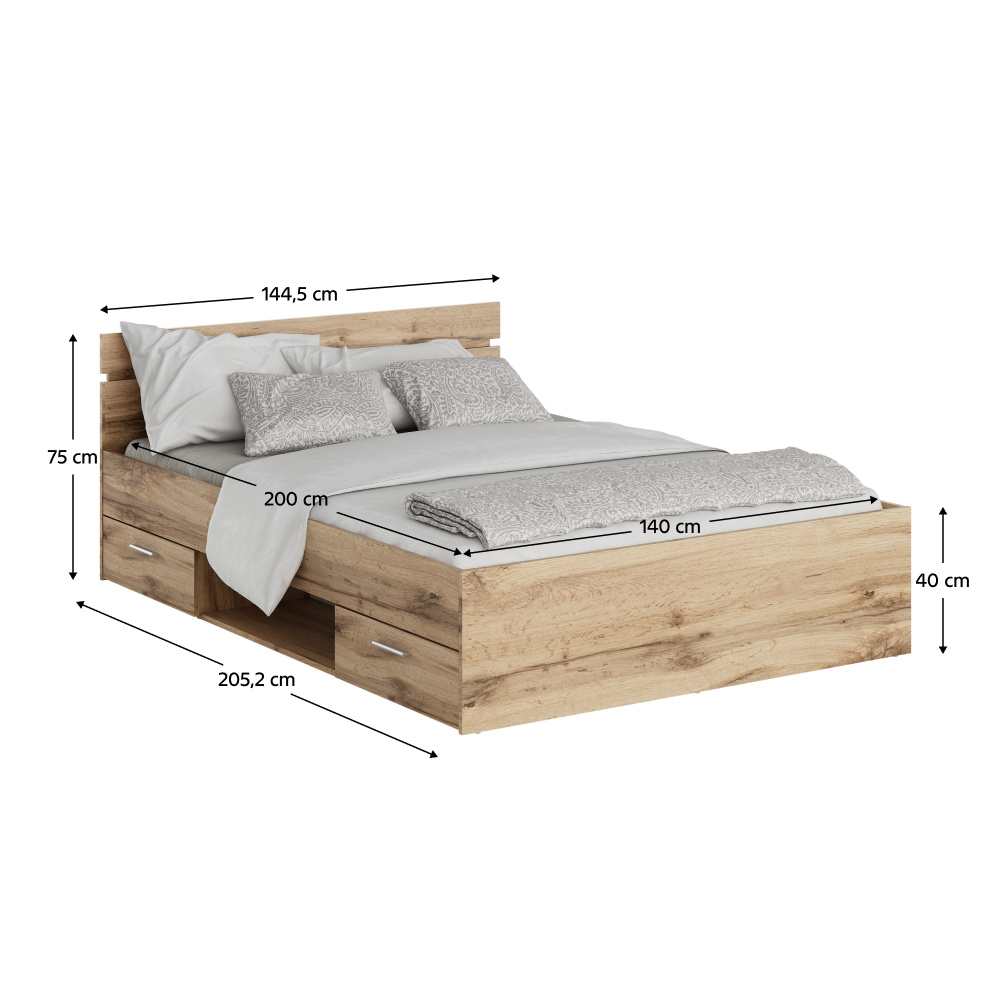 Postel MICHIGAN NEW s šuplíky a s odkládacím prostorem. Materiál: DTD laminovaná. Barevné provedení: dub wotan Rozměry (ŠxHxV): 144,5x205,2x75 cm. Plocha na spaní: 140x200 cm. Výška spaní: 40 cm Výška po rošt: 26 cm Výška matrace: 15 cm Výška po rošt: 26 cm. Oba šuplíky jsou stejné velikosti Nosnost: 2x100 kg. K posteli je možné zakoupit rošt v pevném rámu 140x200 a matraci s rozměrem 140x200 cm na základě naší nabídky.