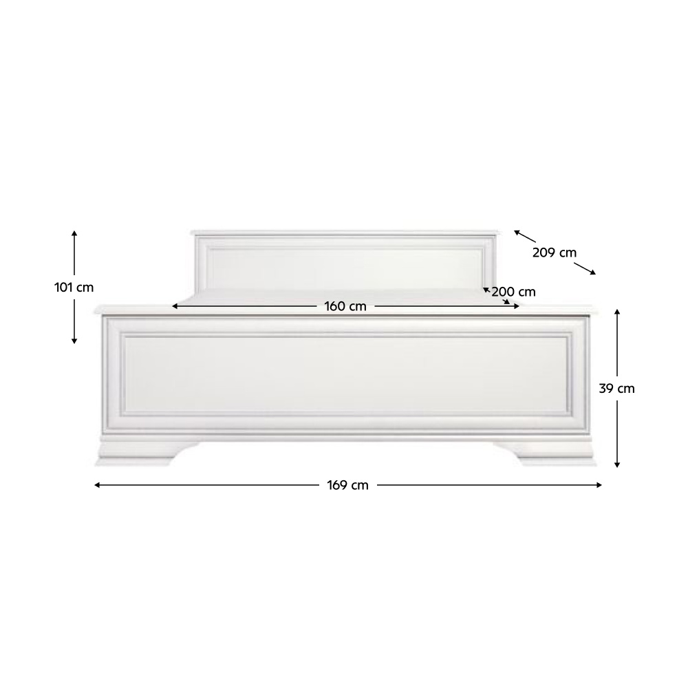 Materiál: DTD laminovaná Barva: alpská bílá Rozměry (ŠxHxV): 169x209x101 cm Plocha na spaní (ŠxD): 160x200 cm Výška bočnice: 22 cm Tloušťka materiálu: 1,6 cm Na nožičkách Výška nožiček: 8 cm Dodávána bez roštu Doporučujeme zakoupit samonosný rošt KENTAK z naší nabídky Dodávána bez matrace Možnost dokoupit matraci z naší nabídky Doporučená výška matrace: 16 cm Nosnost na osobu: 100 kg Dodáváno v demontu
