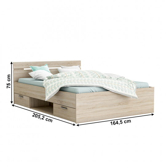 Postel MICHIGAN s šuplíky a s odkládacím prostorem. Materiál: DTD foliovaná. Barevné provedení: dub sonoma Rozměry (ŠxHxV): 164,5x205,2x75 cm Plocha na spaní: 160x200 cm. Výška spaní: 40 cm Výška po rošt: 26 cm Výška matrace: 15 cm Nosnost: 110 kg K posteli je možné zakoupit rošt v pevném rámu160x200 a matraci s rozměrem 160x200 cm na základě naší nabídky.
