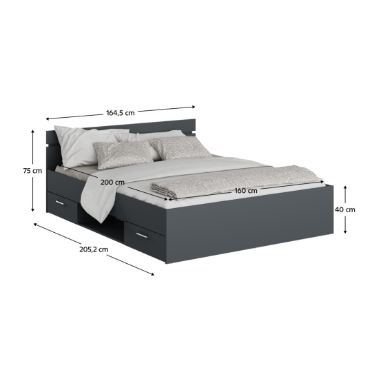 Postel MICHIGAN NEW s šuplíky a s odkládacím prostorem. Materiál: DTD laminovaná. Barevné provedení: grafit Rozměry (ŠxHxV): 164,5x205,2x75 cm Plocha na spaní: 160x200 cm. Výška spaní: 40 cm Výška po rošt: 26 cm Výška matrace: 15 cm Nosnost: 110 kg K posteli je možné zakoupit rošt v pevném rámu 160x200 a matraci s rozměrem 160x200 cm na základě naší nabídky.