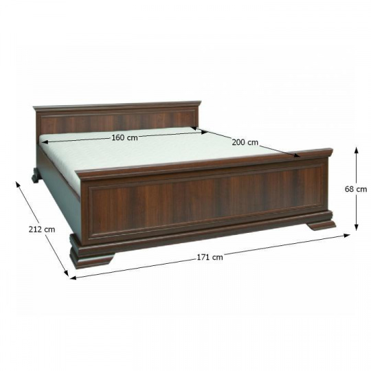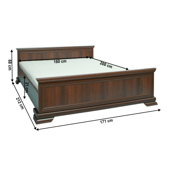 Postel 160x200, KORA KLS Materiál: laminovaná DTD, MDF Barevné provedení: samoa king. Rozměry (ŠxHxV): 171x212x68 cm Tloušťka materiálu: 22 mm Plocha na spaní: 160x200 cm Výška spodního prostoru od podlahy: 10,5 cm Výška bočnice: 33 cm Výška po rošt: 22,55 cm Nosnost: 110 kg Dodavane s laťovým roštem, bez matrace Doporučujeme zakoupit matraci o minimální výšce 14 cm Výška od roštu po rám dřeva je 11 cm Dodávané v demontu.