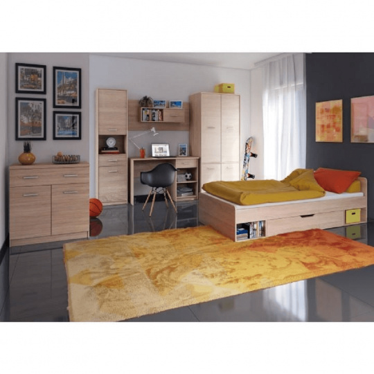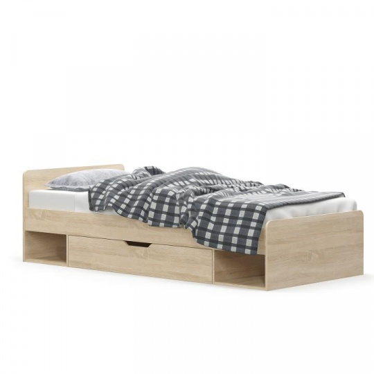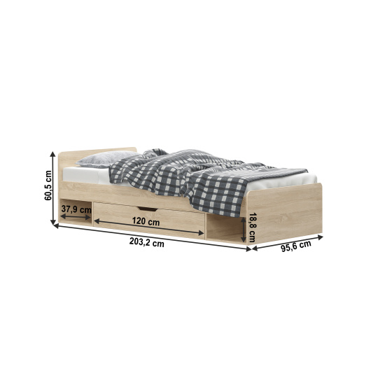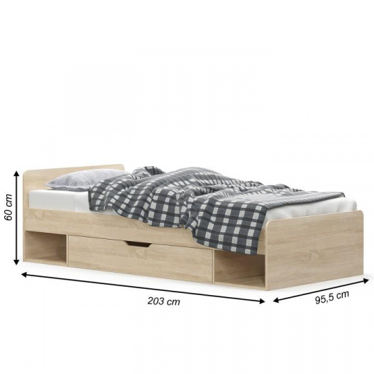Postel 1S / 90 s úložným prostorem TEYO Materiál: DTD laminovaná Barevné provedení: dub sonoma Rozměry (ŠxHxV): 95,6x203,2x60,5 cm Tloušťka materiálu: 16 mm Nosnost: 110 kg Dodávána bez roštu a bez matrace. Doporučujeme dokoupit rolovaný rošt nebo rošt v pevném rámu s rozměrem 90x200 cm. S možností umístit noční stolek a šuplíky z pravé nebo levé strany Doporučujeme pružinovú matrace nebo pěnovú matrace s výškou min. 8 cm Zapuštění roštu: 5 cm Dodávána v demontu.