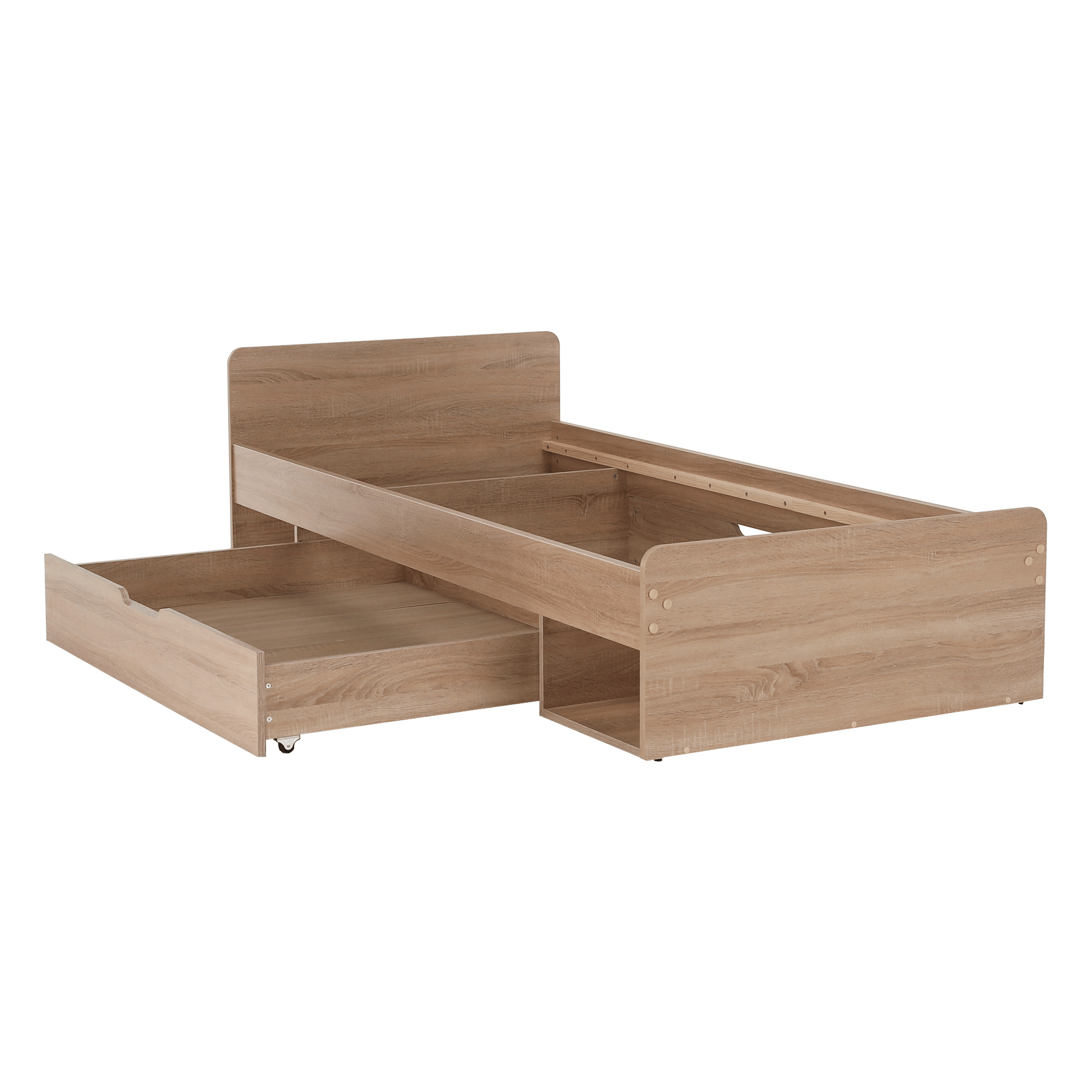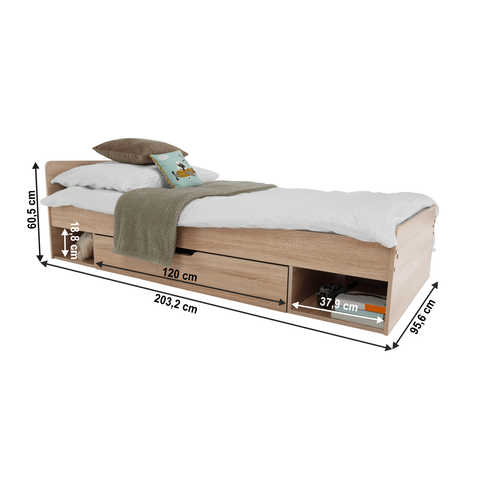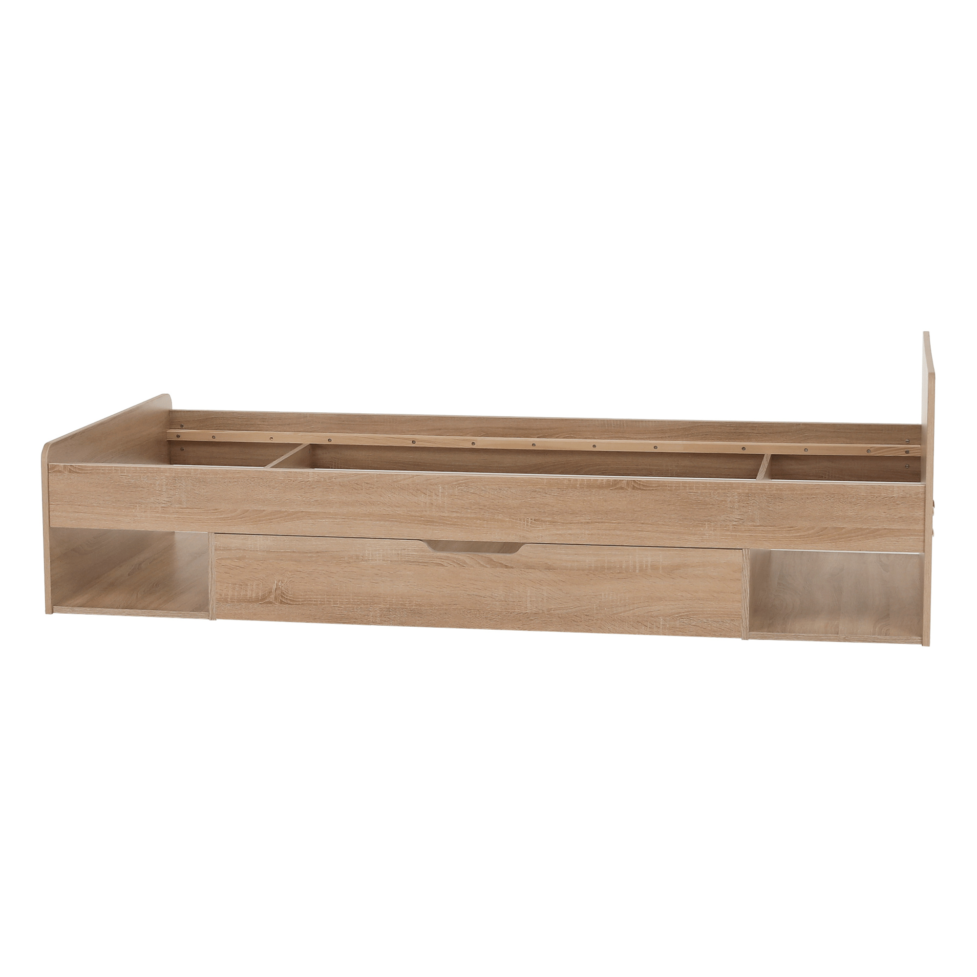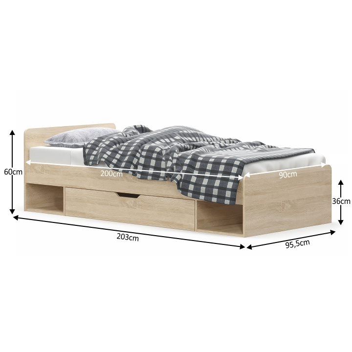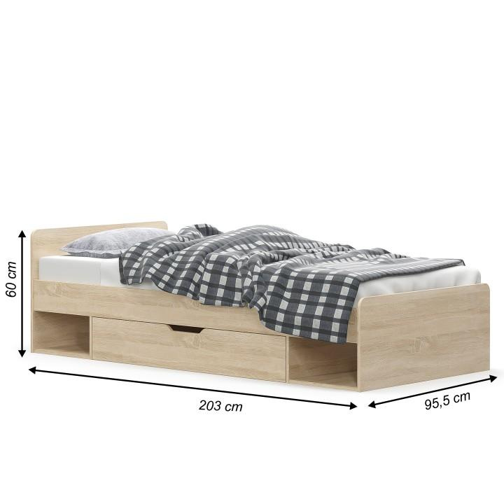 Postel 1S / 90 s úložným prostorem TEYO Materiál: DTD laminovaná Barevné provedení: dub sonoma Rozměry (ŠxHxV): 95,6x203,2x60,5 cm Tloušťka materiálu: 16 mm Nosnost: 110 kg Dodávána bez roštu a bez matrace. Doporučujeme dokoupit rolovaný rošt nebo rošt v pevném rámu s rozměrem 90x200 cm. S možností umístit noční stolek a šuplíky z pravé nebo levé strany Doporučujeme pružinovú matrace nebo pěnovú matrace s výškou min. 8 cm Zapuštění roštu: 5 cm Dodávána v demontu.