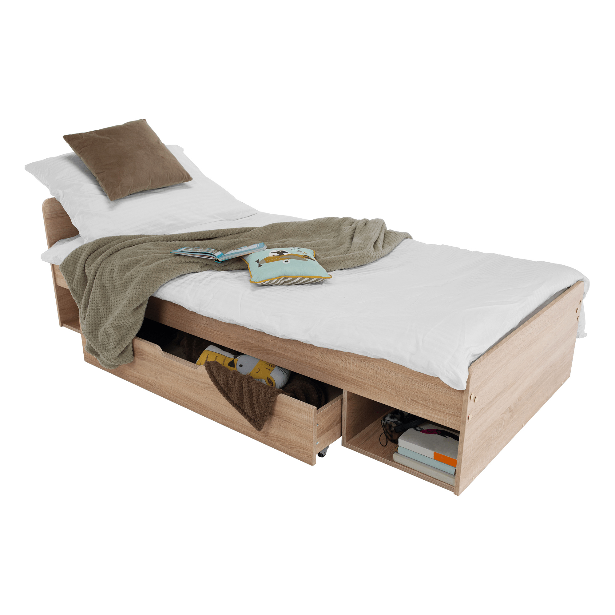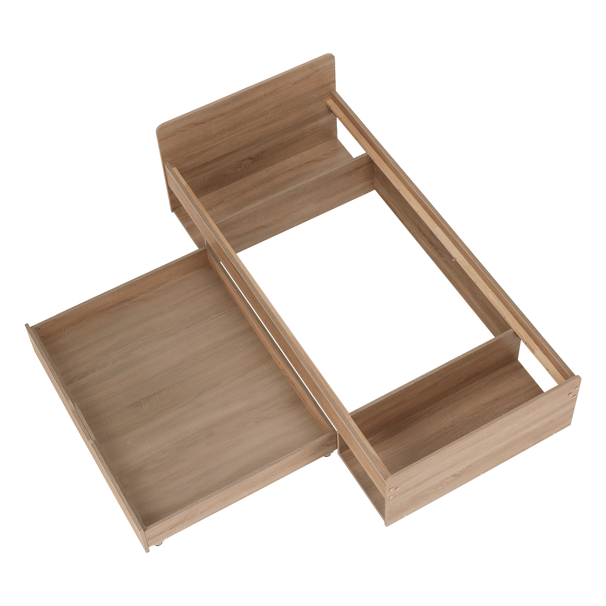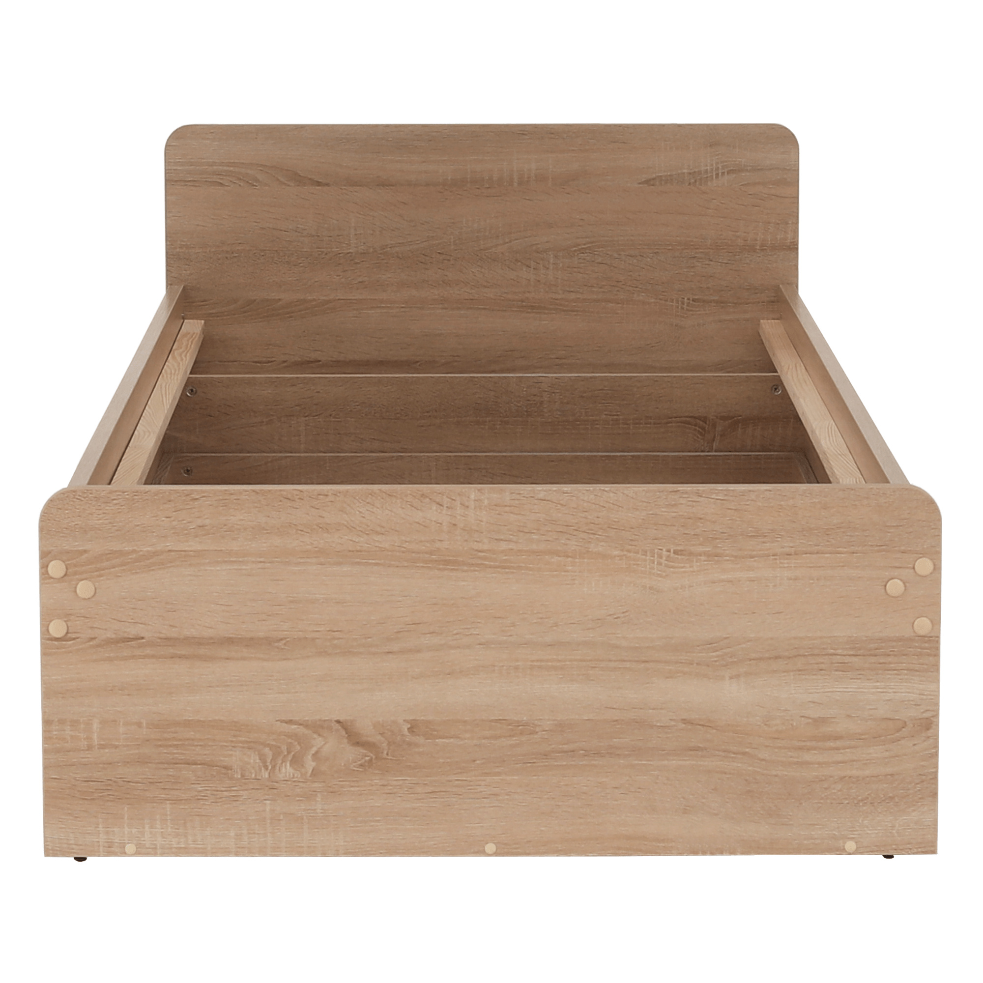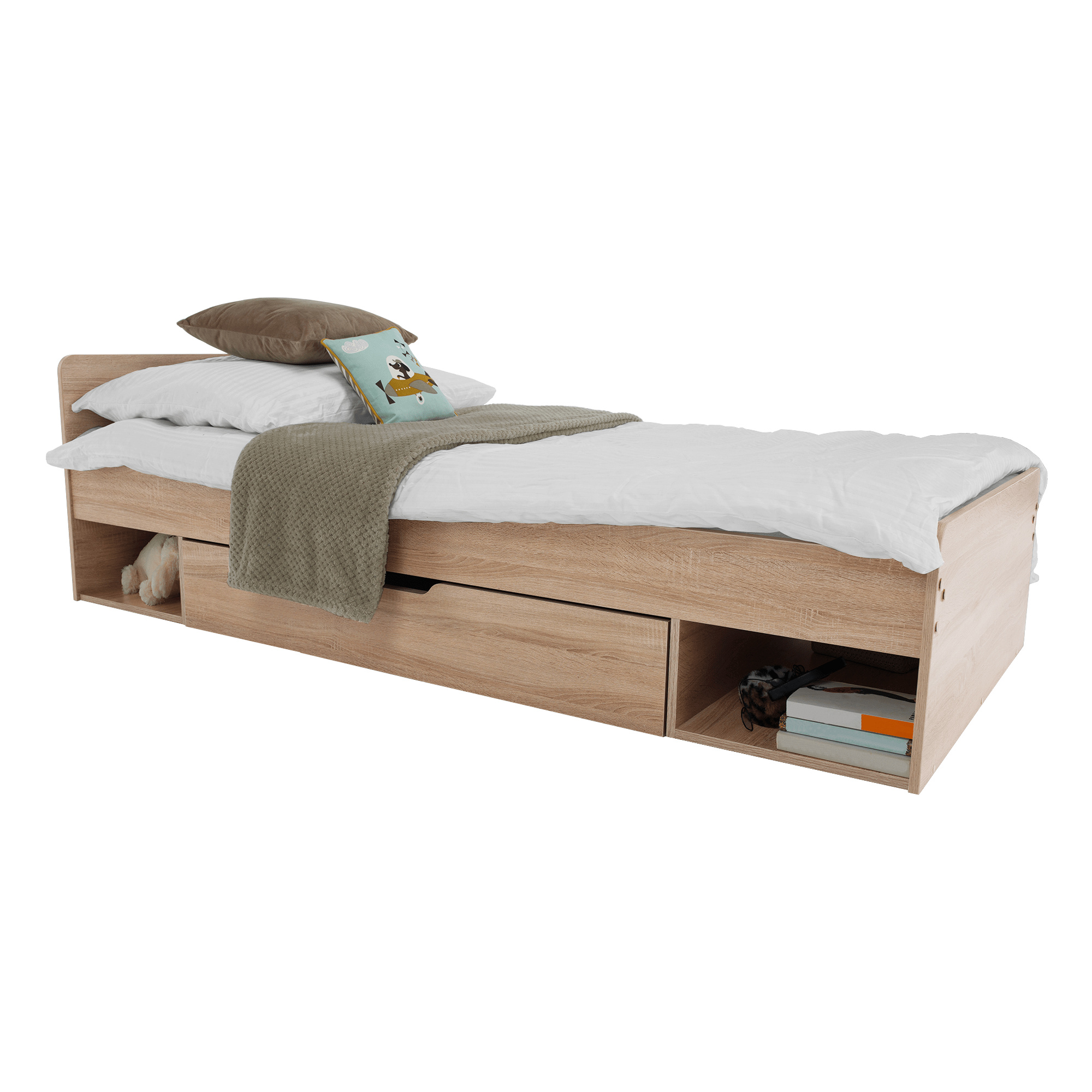 Postel 1S / 90 s úložným prostorem TEYO Materiál: DTD laminovaná Barevné provedení: dub sonoma Rozměry (ŠxHxV): 95,6x203,2x60,5 cm Tloušťka materiálu: 16 mm Nosnost: 110 kg Dodávána bez roštu a bez matrace. Doporučujeme dokoupit rolovaný rošt nebo rošt v pevném rámu s rozměrem 90x200 cm. S možností umístit noční stolek a šuplíky z pravé nebo levé strany Doporučujeme pružinovú matrace nebo pěnovú matrace s výškou min. 8 cm Zapuštění roštu: 5 cm Dodávána v demontu.