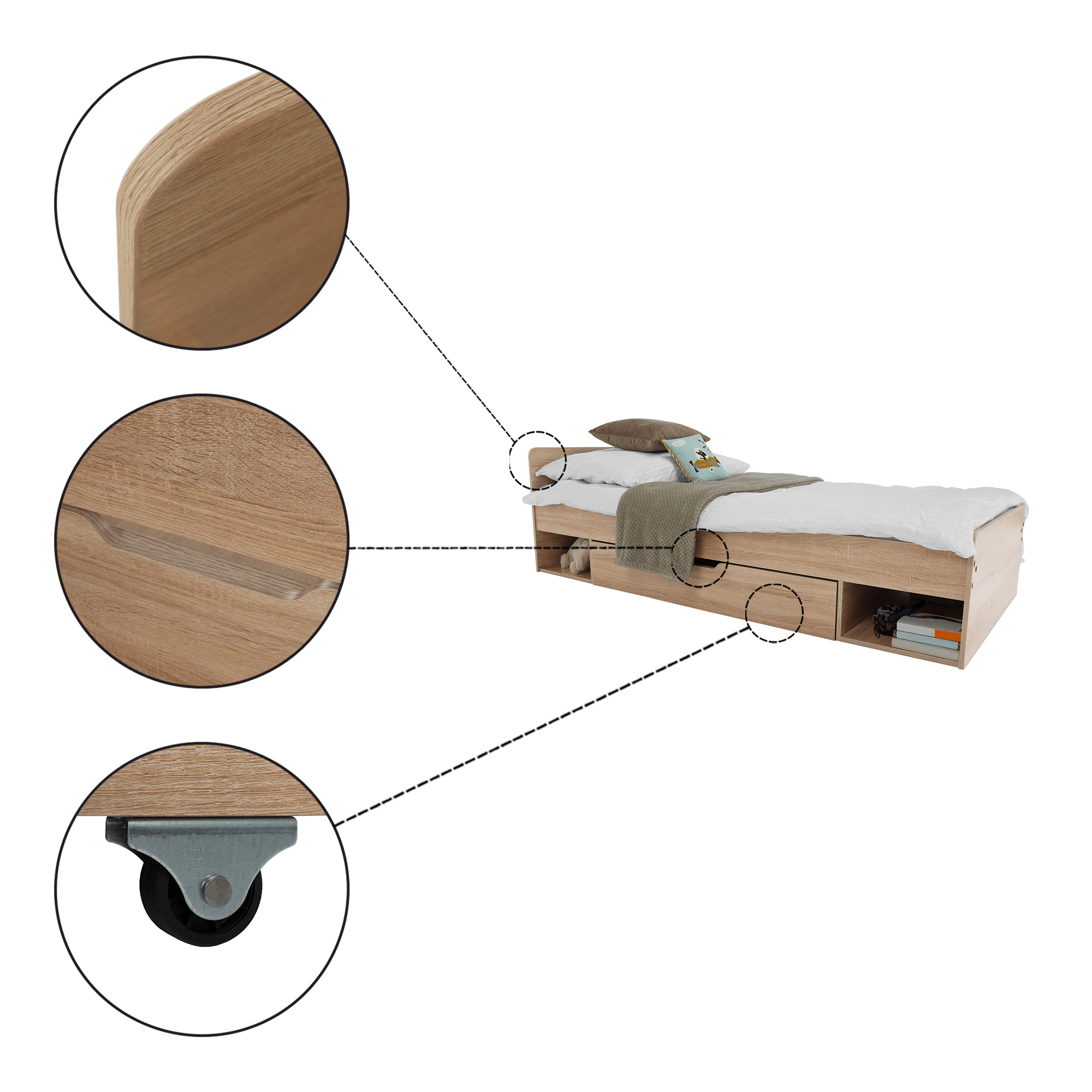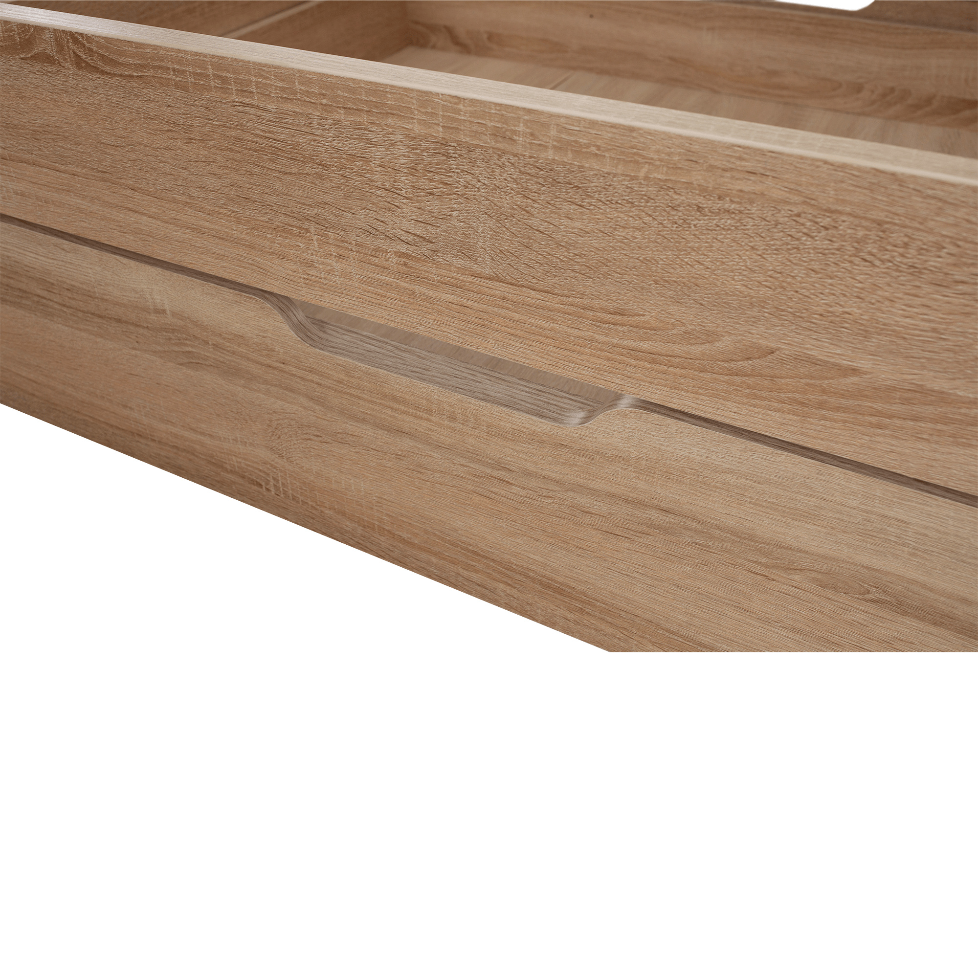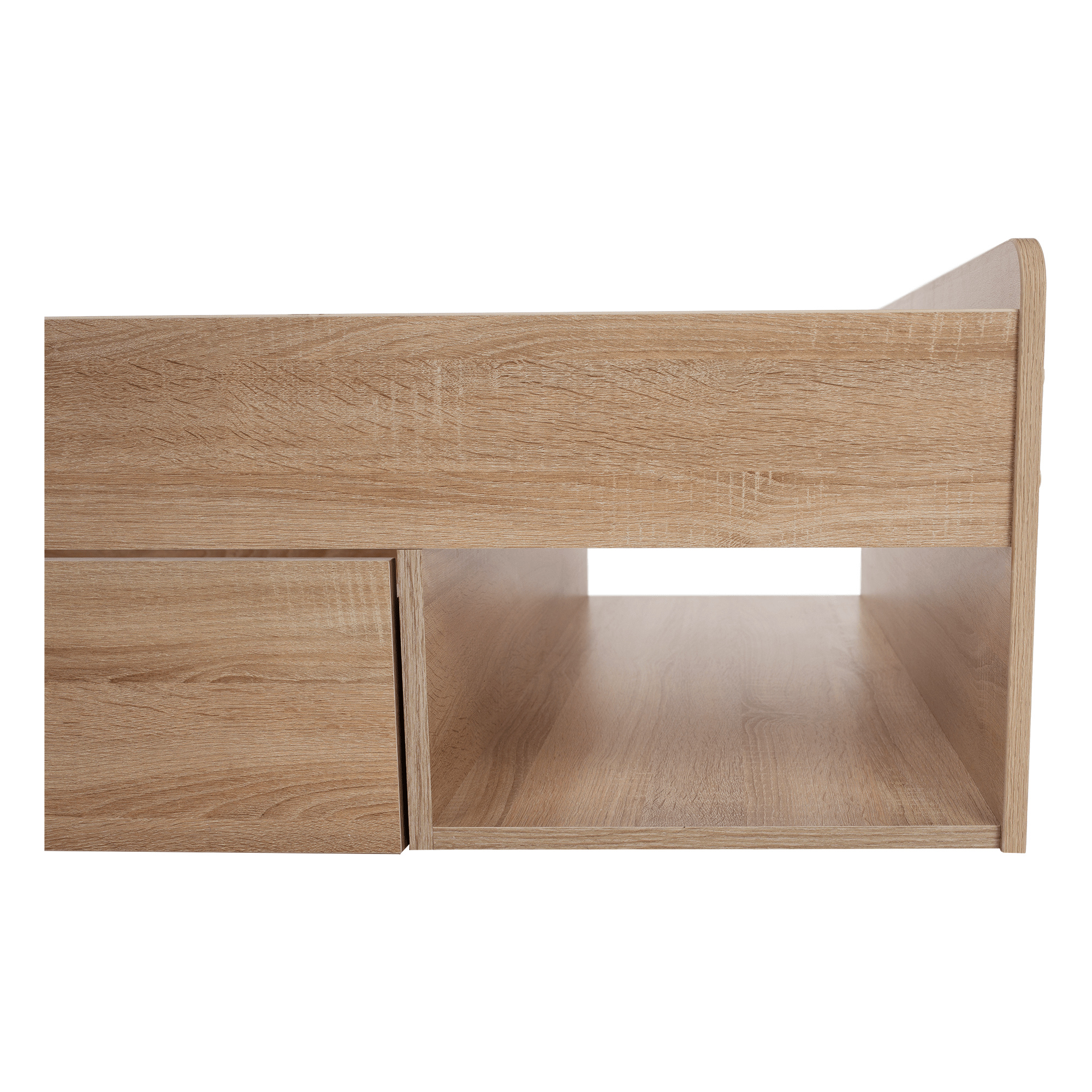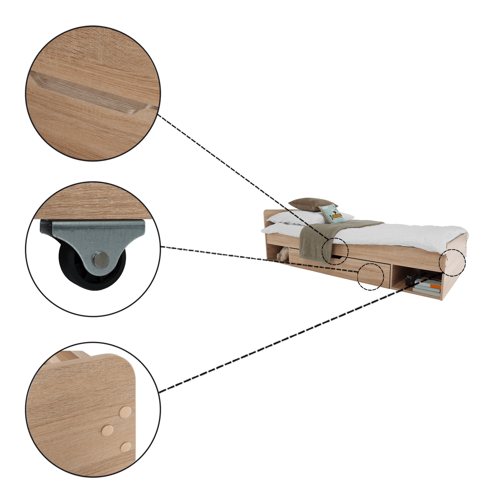Postel 1S / 90 s úložným prostorem TEYO Materiál: DTD laminovaná Barevné provedení: dub sonoma Rozměry (ŠxHxV): 95,6x203,2x60,5 cm Tloušťka materiálu: 16 mm Nosnost: 110 kg Dodávána bez roštu a bez matrace. Doporučujeme dokoupit rolovaný rošt nebo rošt v pevném rámu s rozměrem 90x200 cm. S možností umístit noční stolek a šuplíky z pravé nebo levé strany Doporučujeme pružinovú matrace nebo pěnovú matrace s výškou min. 8 cm Zapuštění roštu: 5 cm Dodávána v demontu.