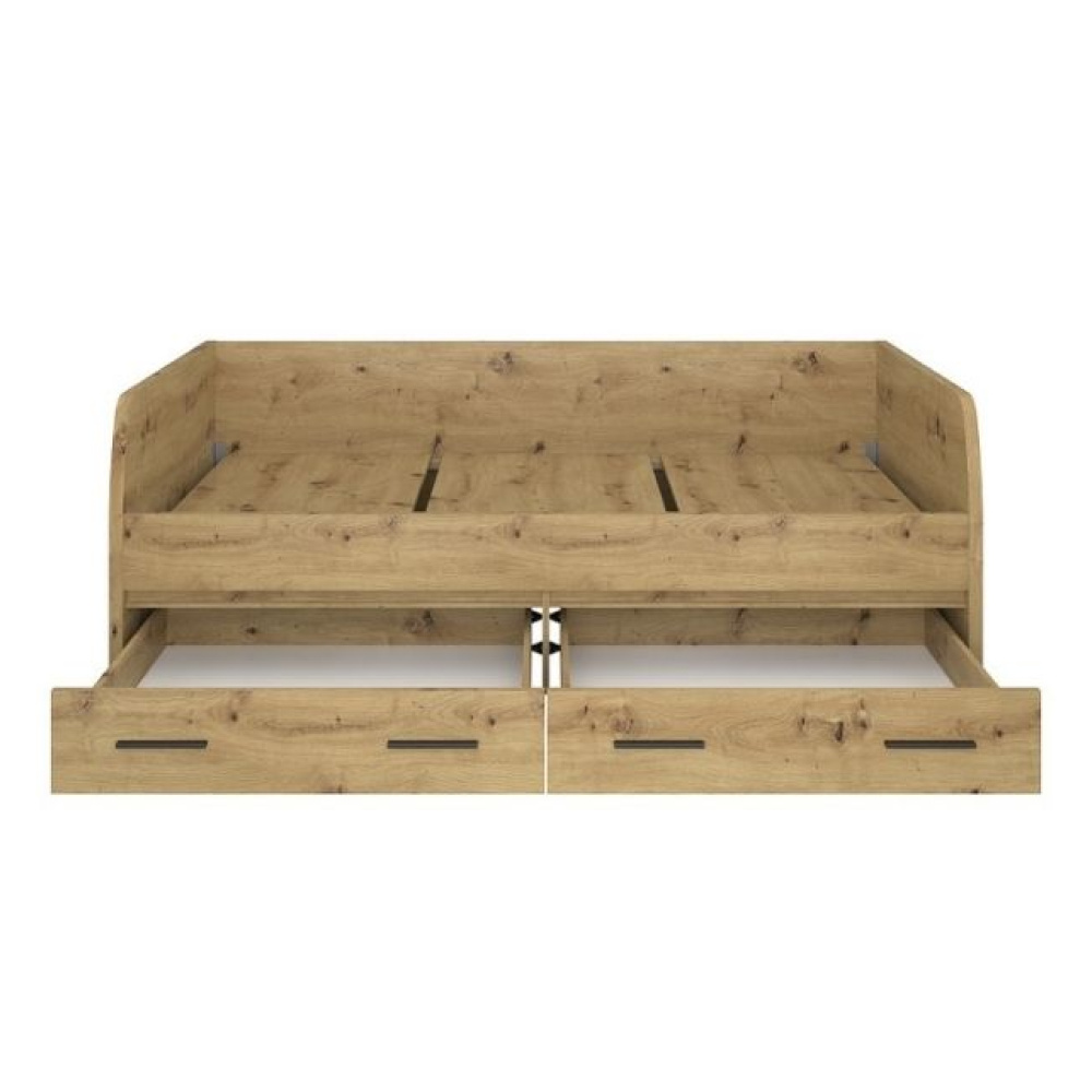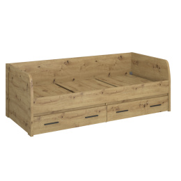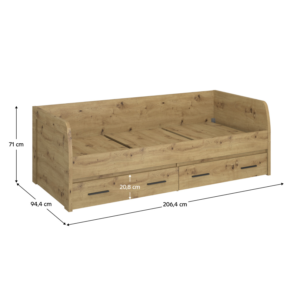 Materiál: DTD laminovaná/ABS hrany Barva: dub artisan Rozměry (ŠxHxV): 94,4x206,4x71 cm Tloušťka materiálu: 1,6-3,2 cm Rozměry plocha na spaní (ŠxD): 90x200 cm Doporučená minimální výška matrace: 7,2 cm S úložným prostorem Dva šuplíky Výška šuplíku: 20,8 cm Nosnost na osobu: 100 kg Dodávána s roštem 3 roštové desky Dodáváno bez matrace Možnost dokoupit matraci z naší nabídky Plastové nožičky Moderní design Dodáváno v demontu