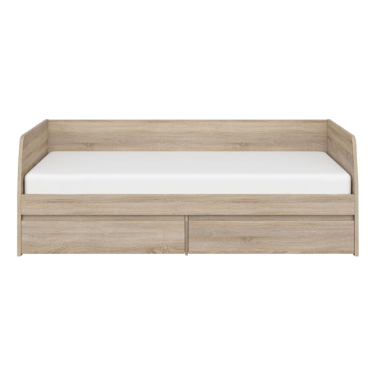 Materiál: DTD laminovaná Barva: dub sonoma Rozměry (ŠxHxV): 94,4x206,4x71 cm Tloušťka materiálu: 3,2 cm Tloušťka materiálu zbývající části: 1,6 cm Rozměry plocha na spaní (ŠxD): 90x200 cm Doporučená minimální výška matrace: 7,2 cm S úložným prostorem Dva šuplíky Výška šuplíku: 20,6 cm Nosnost na osobu: 90 kg Dodáváno s roštem 3 roštové desky Dodáváno bez matrace Možnost dokoupit matraci z naší nabídky Dodáváno v demontu