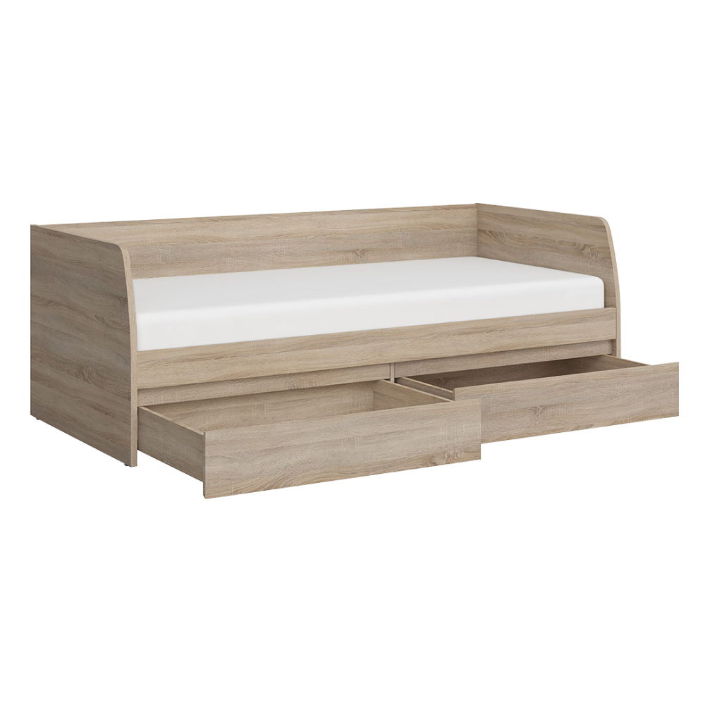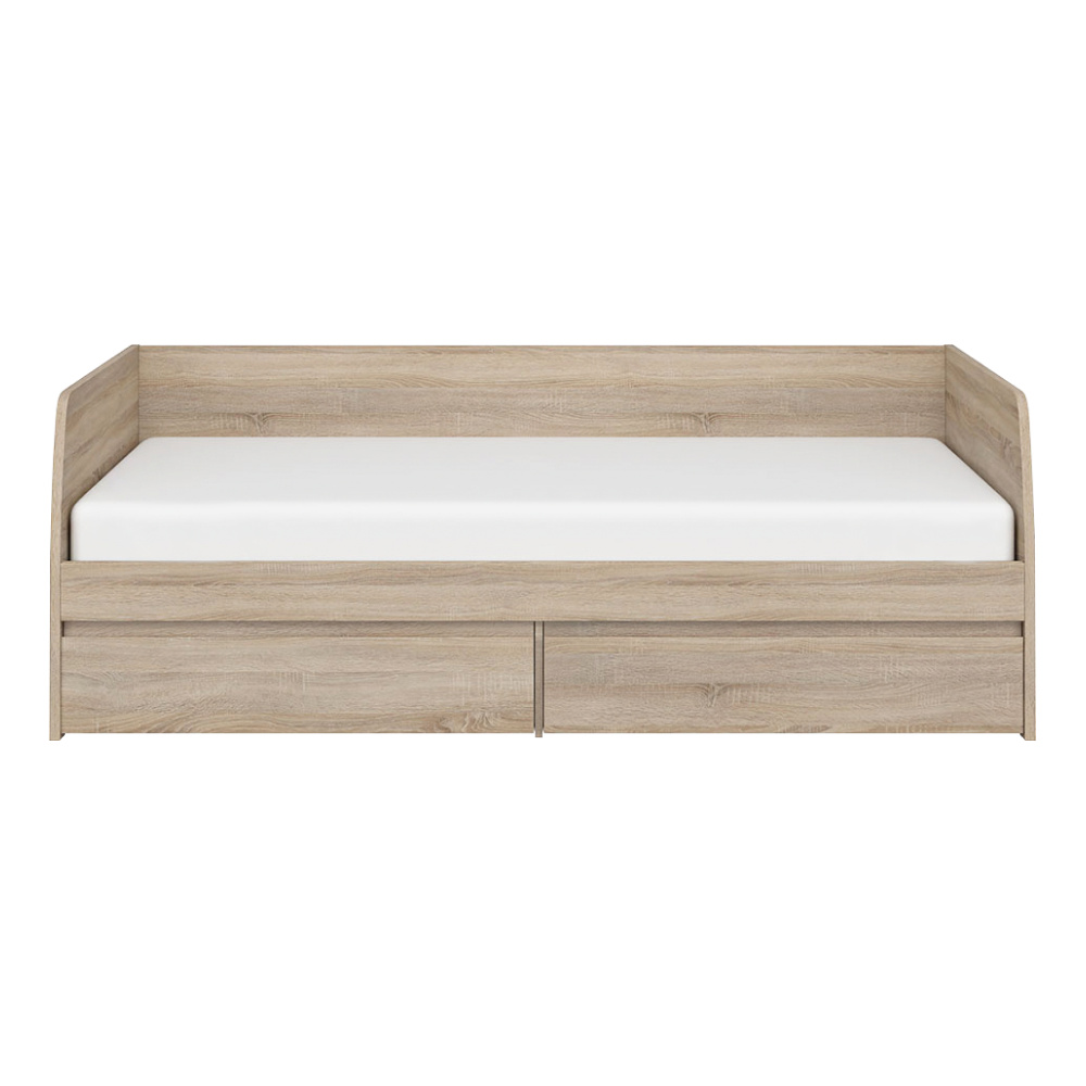 Materiál: DTD laminovaná Barva: dub sonoma Rozměry (ŠxHxV): 94,4x206,4x71 cm Tloušťka materiálu: 3,2 cm Tloušťka materiálu zbývající části: 1,6 cm Rozměry plocha na spaní (ŠxD): 90x200 cm Doporučená minimální výška matrace: 7,2 cm S úložným prostorem Dva šuplíky Výška šuplíku: 20,6 cm Nosnost na osobu: 90 kg Dodáváno s roštem 3 roštové desky Dodáváno bez matrace Možnost dokoupit matraci z naší nabídky Dodáváno v demontu