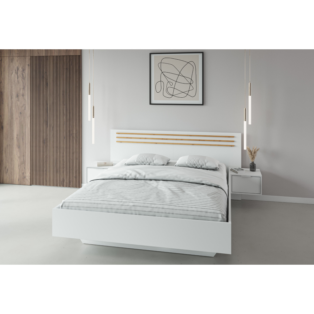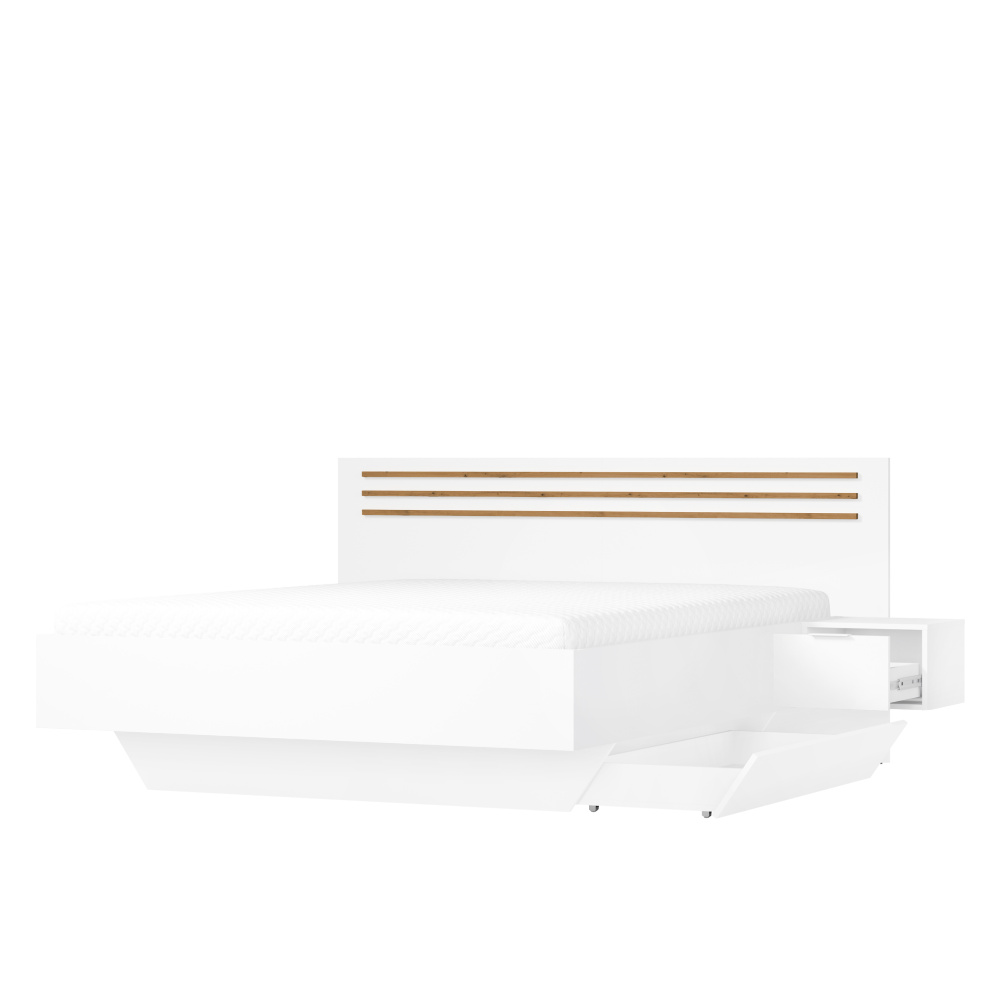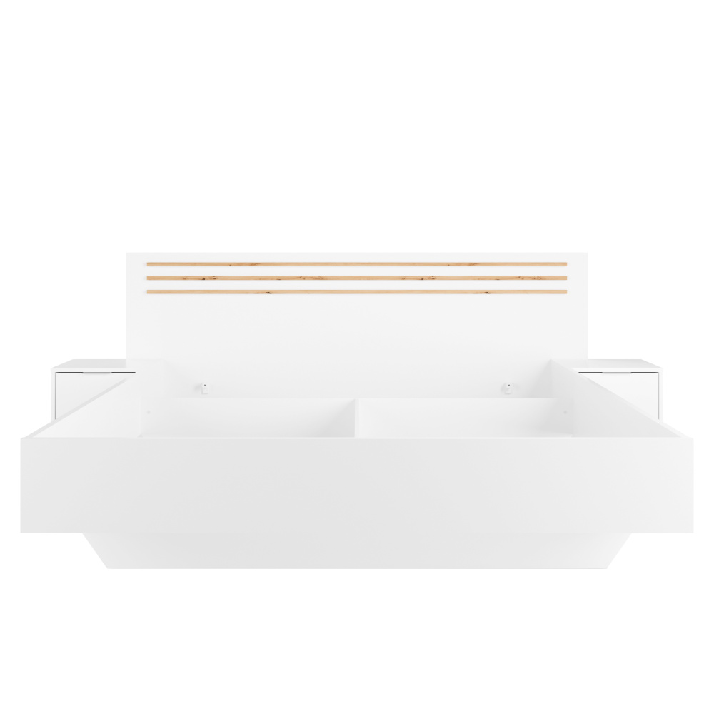 Materiál: DTD laminovaná/MDF/ABS hrany Barva: bílá/dub artisan Rozměry (ŠxHxV): 265,2x204x95,2 cm Plocha na spaní (ŠxD): 180x200 cm Tloušťka materiálu: 1,6 cm Nosnost na osobu: 110 kg Výška po rošt: 34,9 cm 2 noční stolky Nosnost nočního stolku: 20 kg Úložný prostor Zapuštění matrace: 10,8 cm Dodávána bez roštu Doporučujeme zakoupit rošt STELAR z naší nabídky Dodávána bez matrace Možnost dokoupit matraci z naší nabídky Doporučená minimální výška matrace: 15 cm Ozdobné lamely Moderní design Dodáváno v demontu