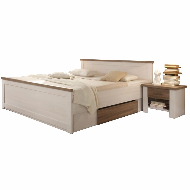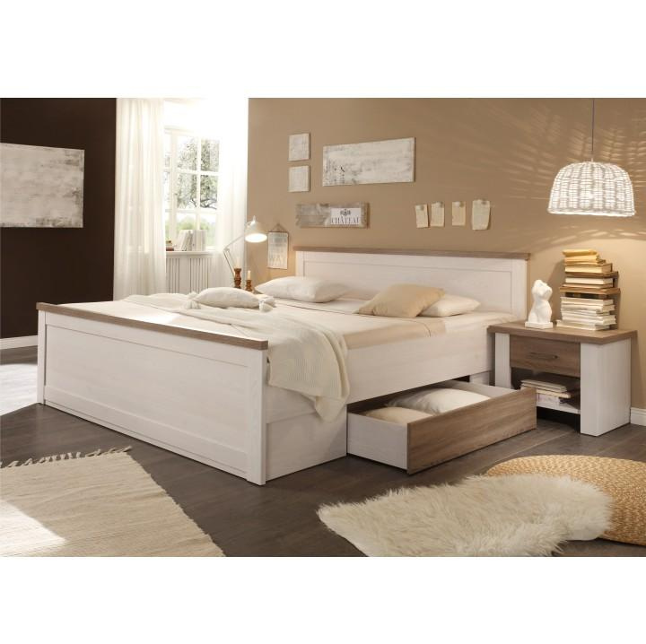 Postel s 2 nočními stolky a s úložným prostorem LUMERA Materiál: DTD fóliovaná Barva: Dub sonoma truflový / pinie bílá Rozměry (ŠxHxV): 186x205x91 cm Rozměry plochy na spaní (ŠxD): 180x200 cm, noční stolek: 60x49x42 cm Tloušťka materiálu korpus: 22 mm Tloušťka materiálu čelo: 18/36 mm Dodávané v demontu.