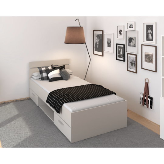 Materiál: DTD laminovaná Barva: cashmere/kašmír Rozměry (ŠxHxV): 94,5x205,2x75 cm Vnitřní rozměry šuplíku (ŠxHxV): 55,5x33,5x11 cm Plocha na spaní (ŠxD): 90x200 cm Výška spaní: 40 cm Výška po rošt: 26 cm Výška matrace: 15 cm Nosnost: 100 kg Dva šuplíky Šuplíky umíte namontovat z pravé nebo levé strany S odkládacím prostorem Možnost dokoupit rošt v pevném rámu Možnost dokoupit matraci Dodáváno v demontu