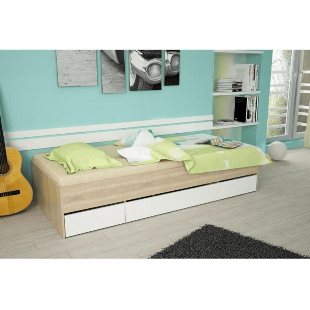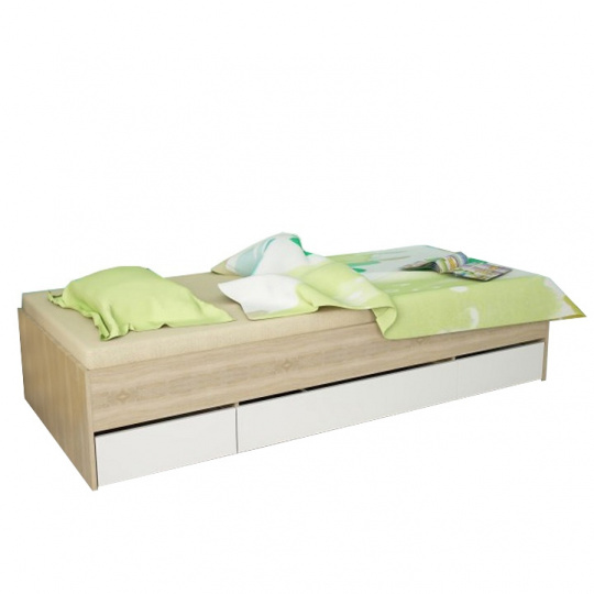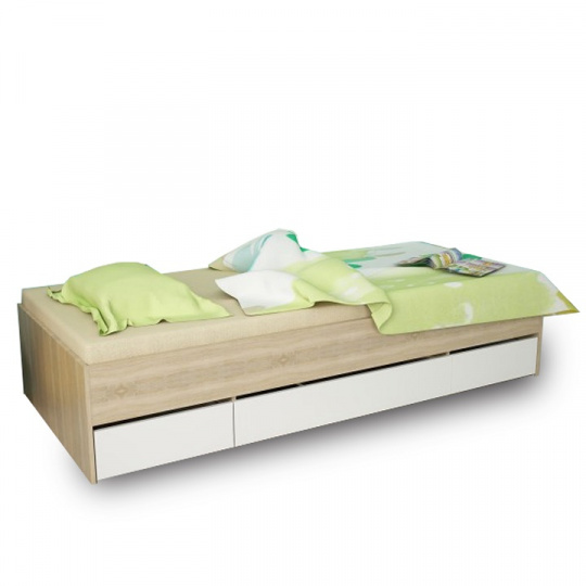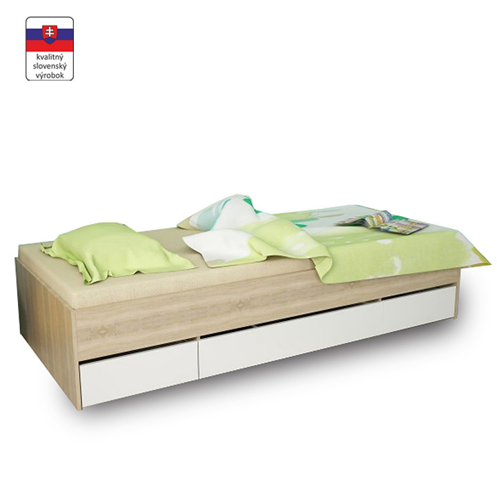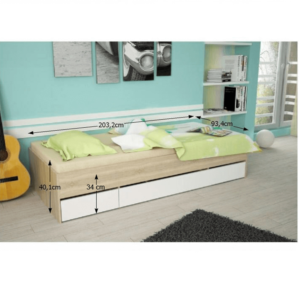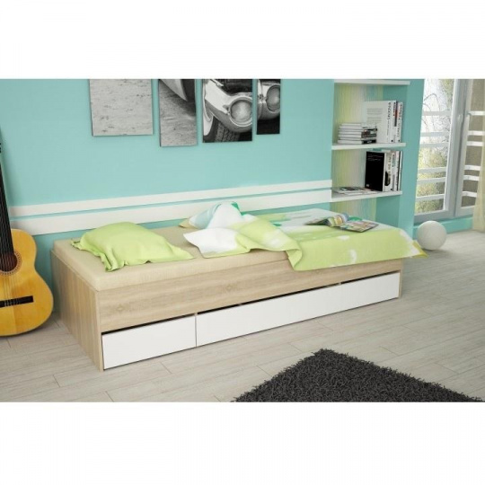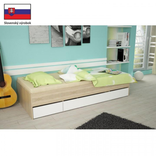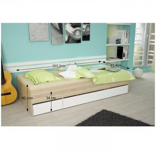 Postel s úložným prostorem 90x200 materiál: laminovaná dřevotříska barevné provedení: dub sonoma / bílá rozměry: (ŠxHxV): 93,4x203,2x40,1 cm Tloušťka materiálu: 16/22 mm Výška matrace: 15 cm Nosnost: 100 kg Bez matrace a roštu. Dodávané v demontu.