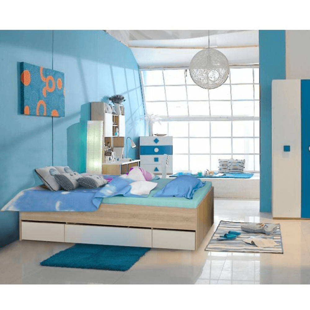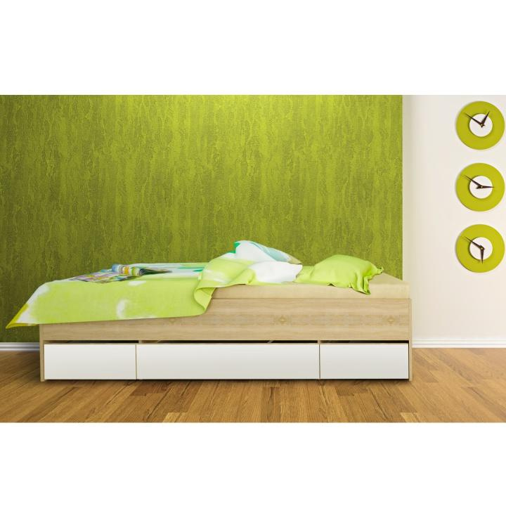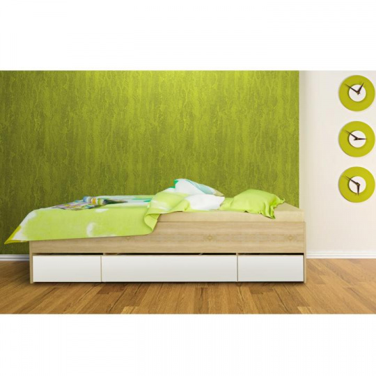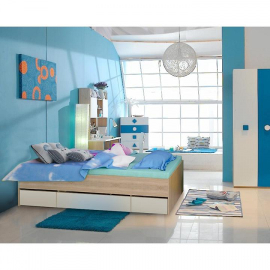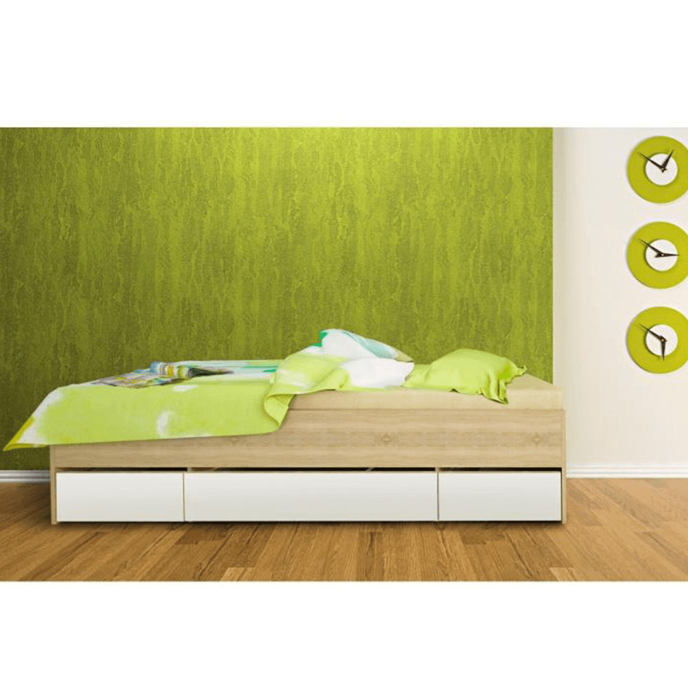 Postel s úložným prostorem 90x200 materiál: laminovaná dřevotříska barevné provedení: dub sonoma / bílá rozměry: (ŠxHxV): 93,4x203,2x40,1 cm Tloušťka materiálu: 16/22 mm Výška matrace: 15 cm Nosnost: 100 kg Bez matrace a roštu. Dodávané v demontu.