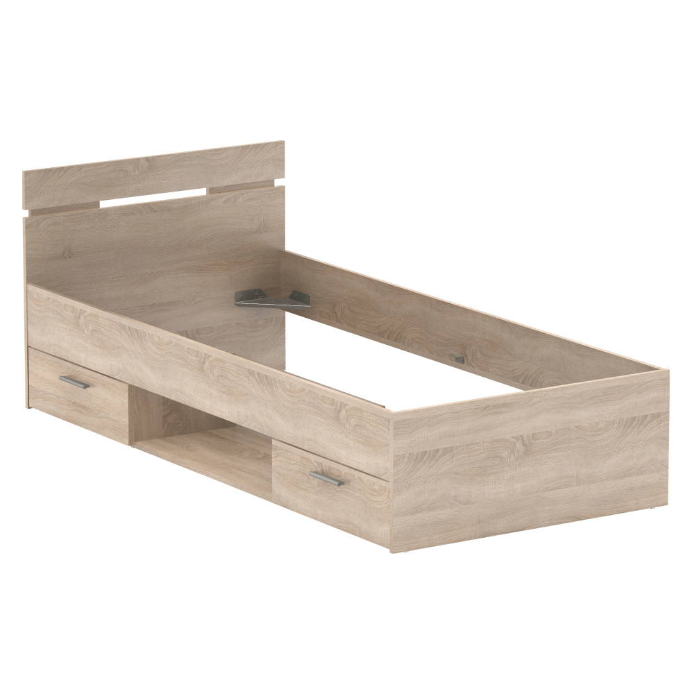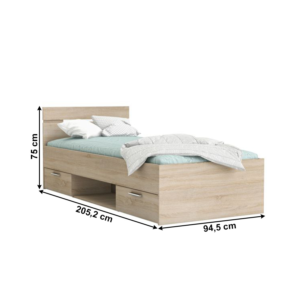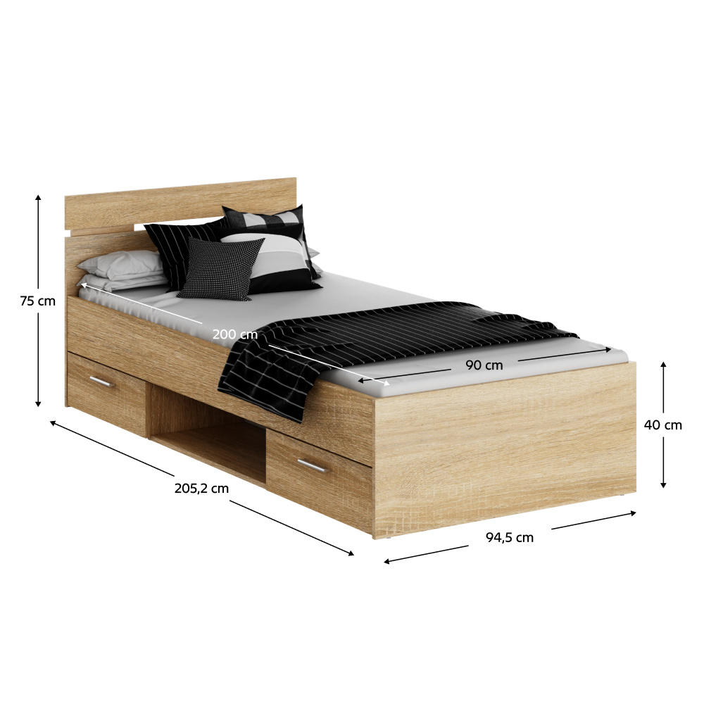 Materiál: DTD laminovaná Rozměry:( ŠxVxH): 94,5x75x205,2 cm Barva: dub sonoma Plocha na spaní (ŠxD): 90x200 cm Výška spaní: 40 cm Výška po rošt: 26 cm Výška matrace: 15 cm Nosnost: 100 kg Dva šuplíky Šuplíky lze namontovat z pravé nebo levé strany S odkládacím prostorem Možnost dokoupit rošt v pevném rámu Možnost dokoupit matraci Dodáváno v demontu