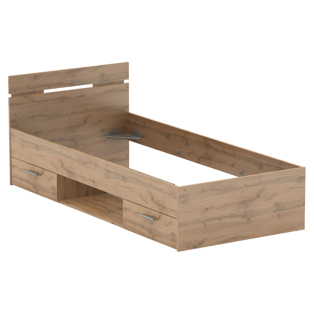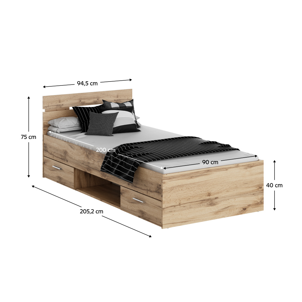 Postel MICHIGAN NEW s šuplíky a s odkládacím prostorem. Materiál: DTD laminovaná Barva: dub wotan Rozměry (ŠxHxV): 94,5x205,2x75 cm Vnitřní rozměry šuplíku (ŠxHxV): 55,5x33,5x11 cm Plocha na spaní (ŠxD): 90x200 cm Výška spaní: 40 cm Výška po rošt: 26 cm Výška matrace: 15 cm Nosnost: 100 kg Dva šuplíky Šuplíky lze namontovat z pravé nebo levé strany S odkládacím prostorem Možnost dokoupit rošt Možnost dokoupit matraci Dodáváno v demontu K posteli je možné zakoupit rošt v pevném rámu 90x200 a matraci s rozměrem 90x200 cm na základě naší nabídky.