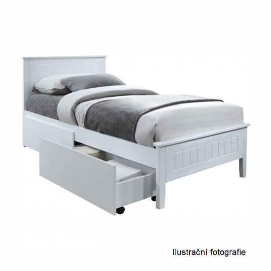 Materiál: masivní dřevo / MDF Barva: bílá Rozměry (ŠxHxV): 98,8x209,4x92,2 cm Plocha na spaní (ŠxH): 90x200 cm Výška po rošt: 31,5 cm Nosnost: 110 kg Dodávané s laťkovým roštem Dodávané bez matrace Možnost dokoupit matrace z naší nabídky Dodávané bez zásuvných kontejnerů Možnost dokoupit zásuvný kontejner Dodávané v demontu