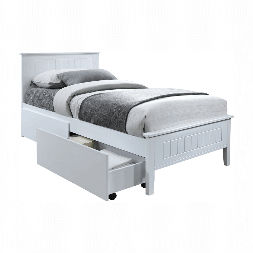 Materiál: masivní dřevo / MDF Barva: bílá Rozměry (ŠxHxV): 98,8x209,4x92,2 cm Plocha na spaní (ŠxH): 90x200 cm Výška po rošt: 31,5 cm Nosnost: 110 kg Dodávané s laťkovým roštem Dodávané bez matrace Možnost dokoupit matrace z naší nabídky Dodávané bez zásuvných kontejnerů Možnost dokoupit zásuvný kontejner Dodávané v demontu