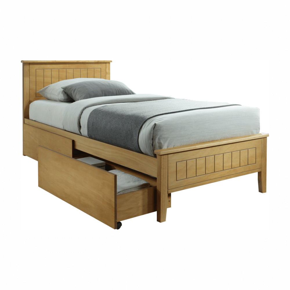 Materiál: masivní dřevo / MDF Barva: dub Rozměry (ŠxHxV): 98,8x209,4x92,2 cm Plocha na spaní (ŠxH): 90x200 cm Výška po rošt: 31,5 cm Nosnost: 110 kg Dodávané s laťkovým roštem Dodávané bez matrace Možnost dokoupit matrace z naší nabídky Dodávané bez zásuvných kontejnerů Možnost dokoupit zásuvný kontejner Dodávané v demontu