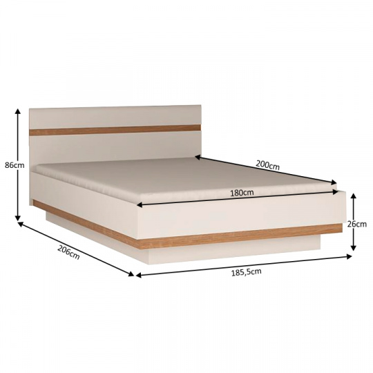 Postel 180 LYNATET 93 Provedení: bílá extra vysoký lesk HG / dub sonoma truflový Materiál: DTD laminovaná Moderní zaoblené hrany. Korpus je v matném provedení Čelo postele je v provedení extra vysoký lesk Rozměry (ŠxHxV): 185,5x206x88 cm. Tloušťka materiálu: 16 mm Nosnost: 110 kg Doporučujeme zakoupit matraci s rolovaným roštem o minimální výšce 20 cm Dodávané v demontu.