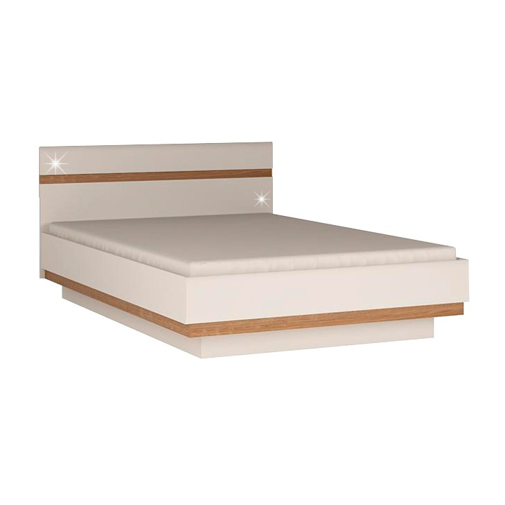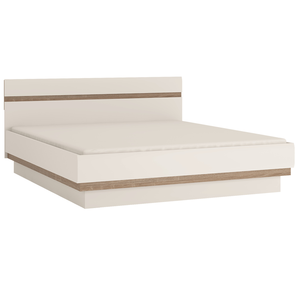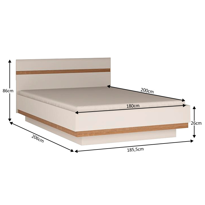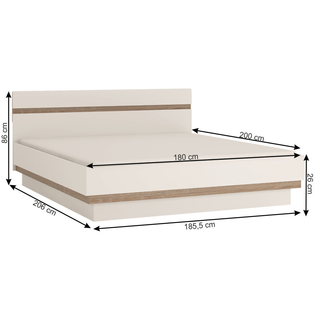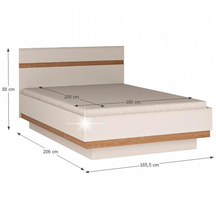 Postel 180 LYNATET 93 Provedení: bílá extra vysoký lesk HG / dub sonoma truflový Materiál: DTD laminovaná Moderní zaoblené hrany. Korpus je v matném provedení Čelo postele je v provedení extra vysoký lesk Rozměry (ŠxHxV): 185,5x206x88 cm. Tloušťka materiálu: 16 mm Nosnost: 110 kg Doporučujeme zakoupit matraci s rolovaným roštem o minimální výšce 20 cm Dodávané v demontu.