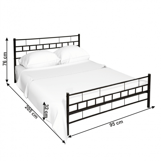 Materiál: kov Barva: černá Rozměry (ŠxHxV): 95x205x76 cm Rozměry lůžka (ŠxH): 90x200 cm Dodávaná s lamelovým roštem Výška po rošt: 32 cm Nosnost na lůžko: 150 kg Dodávané bez matrace Možnost zakoupit matrace z naší nabídky Dodávané v demontu