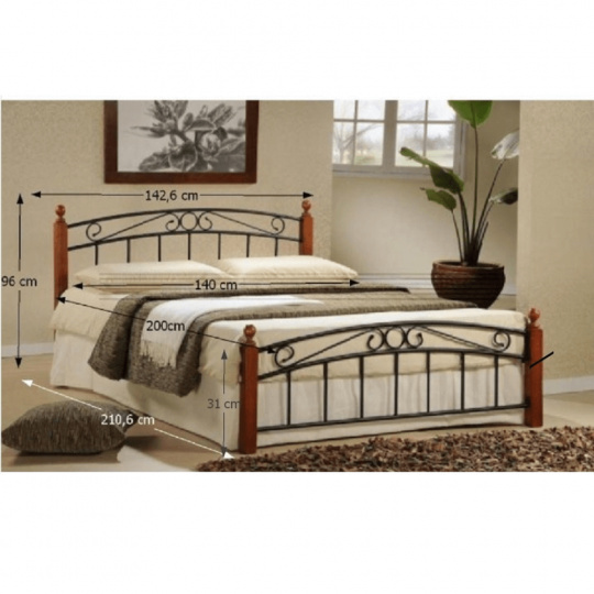 Kovová postel s lamelovým roštem DOLORES Materiál: kov/dřevo Barva: černá/třešeň Rozměry (ŠxHxV): 142,6x210,6x96 cm Plocha na spaní: 140x200 cm Výška po rošt: 31 cm Nosnost: 100 kg Dodávána s lamelovým roštem Dodávána bez matrace Dodáváno v demontu