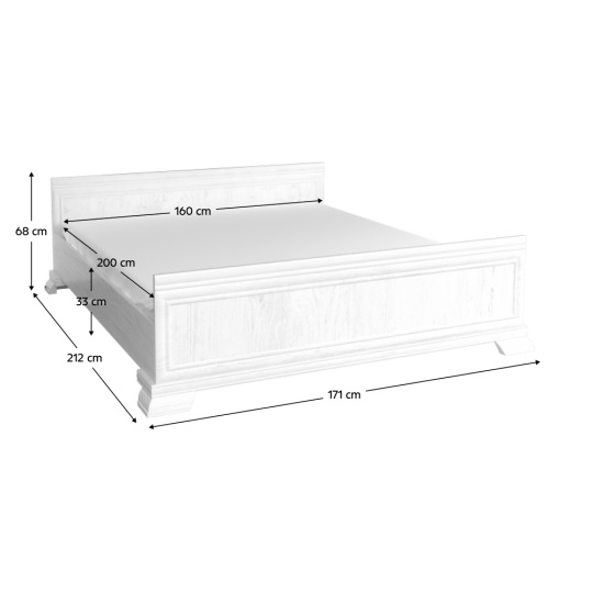 Postel KLS KORA. Barevné provedení sosna andersen. Materiál laminovaná DTD, MDF. Rozměry (ŠxHxV): 171x212x68 cm Rozměry plocha na spaní (ŠxD): 160x200 cm Tloušťka materiálu: 22 mm Nosnost: 110 kg Výška spodního prostoru od podlahy: 10,5 cm Výška po rošt: 22,55 cm Výška bočnice: 33 cm Postel je dodávána s laťovým roštem, bez matrace. Doporučujeme zakoupit matraci o minimální výšce 14 cm Výška od roštu po rám dřeva je 11 cm